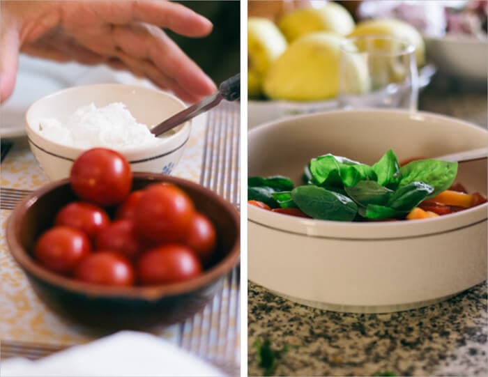 - Coarsely chop cherry tomatoes and basil and place into a medium mixing bowl