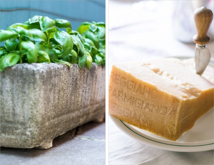 Below you can see my family’s healthy basil plant (ok, one of many) and quite a large block of fresh Parmigiano-Reggiano. An important item in any Italian household is the basil plant that provides its leaves for so many Italian dishes. My uncle has two of these planters with basil, one with rosemary, and another with thyme, outside soaking up the Italian sun all summer long. The block of cheese was extremely sharp and provided a great contrast to the sweet cherry tomatoes for a balanced dish. You could just as easily use standard Parmesan found at the store if PR is not available.