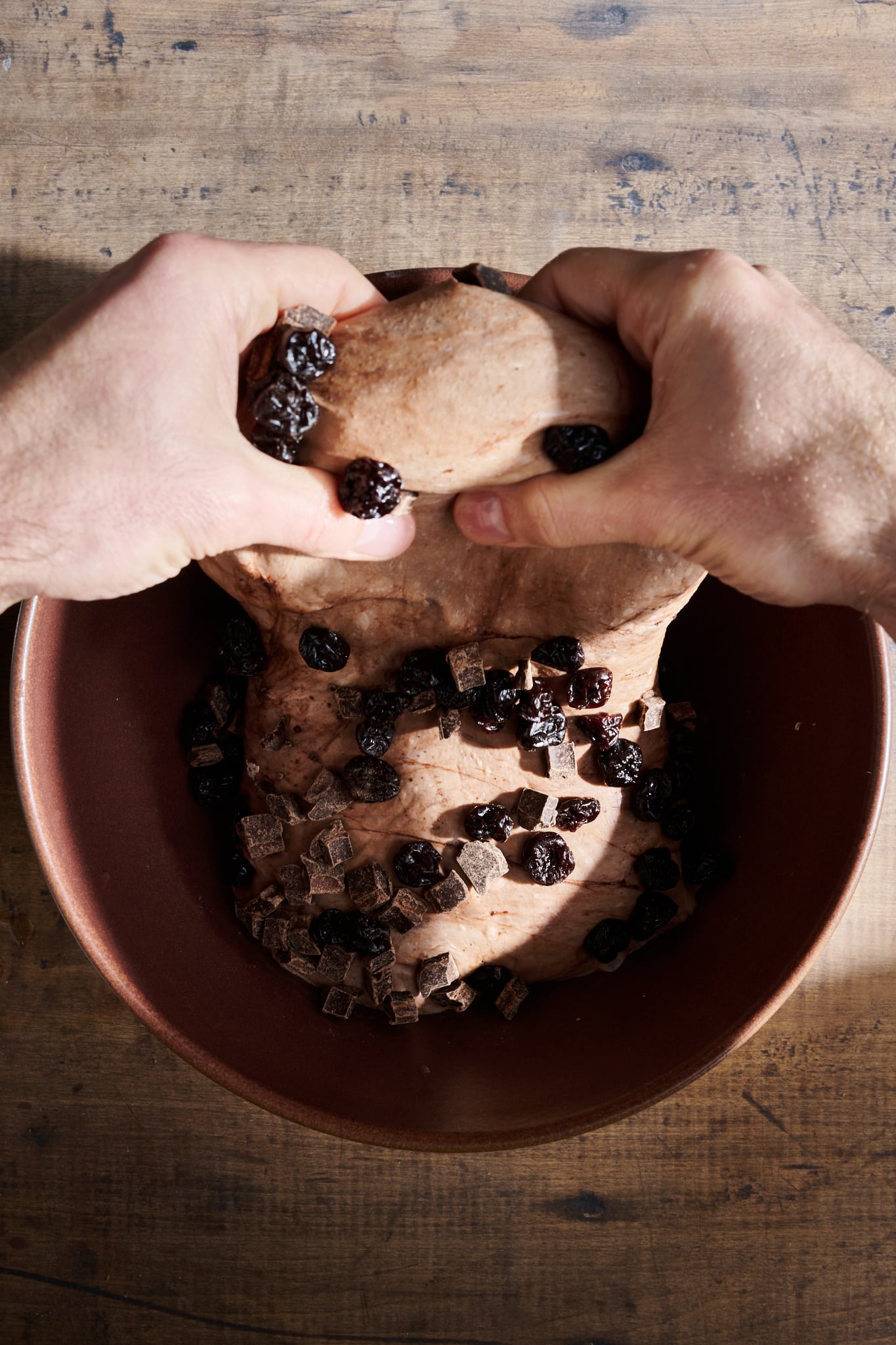 This dough will need 3 sets of stretches and folds during bulk fermentation where the first set starts after 30 minutes into bulk fermentation and the subsequent sets are at 30-minute intervals. During the first set of stretches and folds, add the mixed together chocolate and cherries as you perform each stretch and fold. After the third set of stretches and folds, let the dough rest, covered, for the remainder of bulk fermentation.
