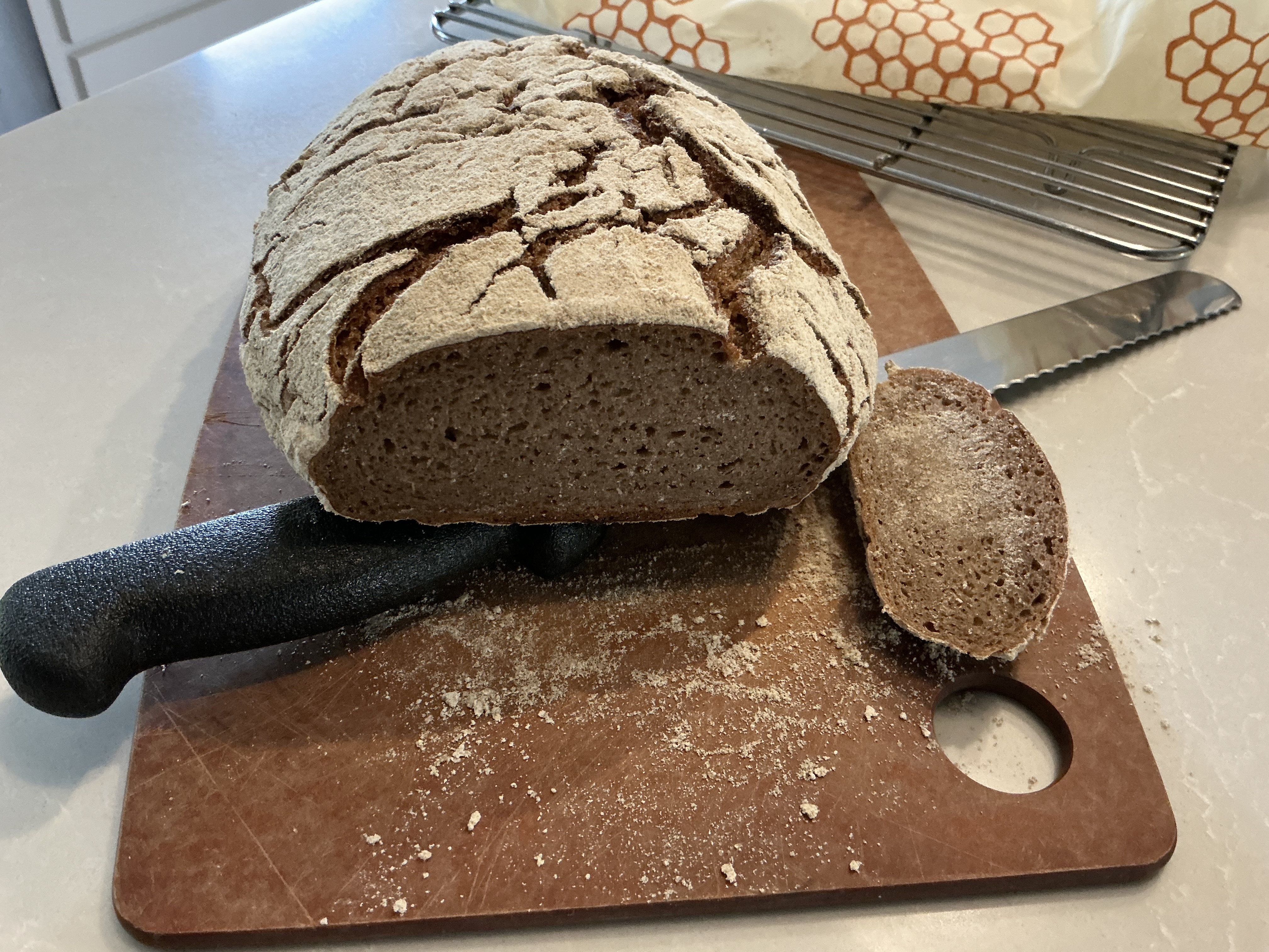 By: A A https://www.theperfectloaf.com/sourdough-90-rye-bread-recipe/comment-page-2/#comment-44024 Fri, 27 Jun 2025 09:55:40 +0000 https://www.theperfectloaf.com/?p=22256#comment-44024 https://uploads.disquscdn.com/images/6bf8d126761eb256b243ee2c9f597615fbc4c1cc54715f2da07fef1e69e02c86.jpg https://uploads.disquscdn.com/images/78eabdeef18dc17e162d9fef69fb285d8df2c4e3885bb4978a9ab71fc1dfb9b5.jpg I got my hands on some organic, dark rye flour and made this yesterday. No exaggeration, it is absolutely fantastic. It makes a beautiful loaf, and the flavor and crumb is excellent – not stodgy at all. I can get nice, thin slices, too. The only variation I made in the recipe was to make it an oval loaf and bake it in a coated cast iron cloche. For my oven, that meant placing the loaf on parchment and placing it all in the preheated pan. Cover (with preheated cover) and bake at 450 degrees for 25 minutes. Uncover, reduce heat to 400 degrees, and bake another 25 minutes. I checked my loaf with an instant read thermometer, and it was ready at 208 internal degrees. Remove from pan to a rack to cool. The hardest part is waiting another 20 hours or so to cut it, but please do to get the perfect rye crumb.