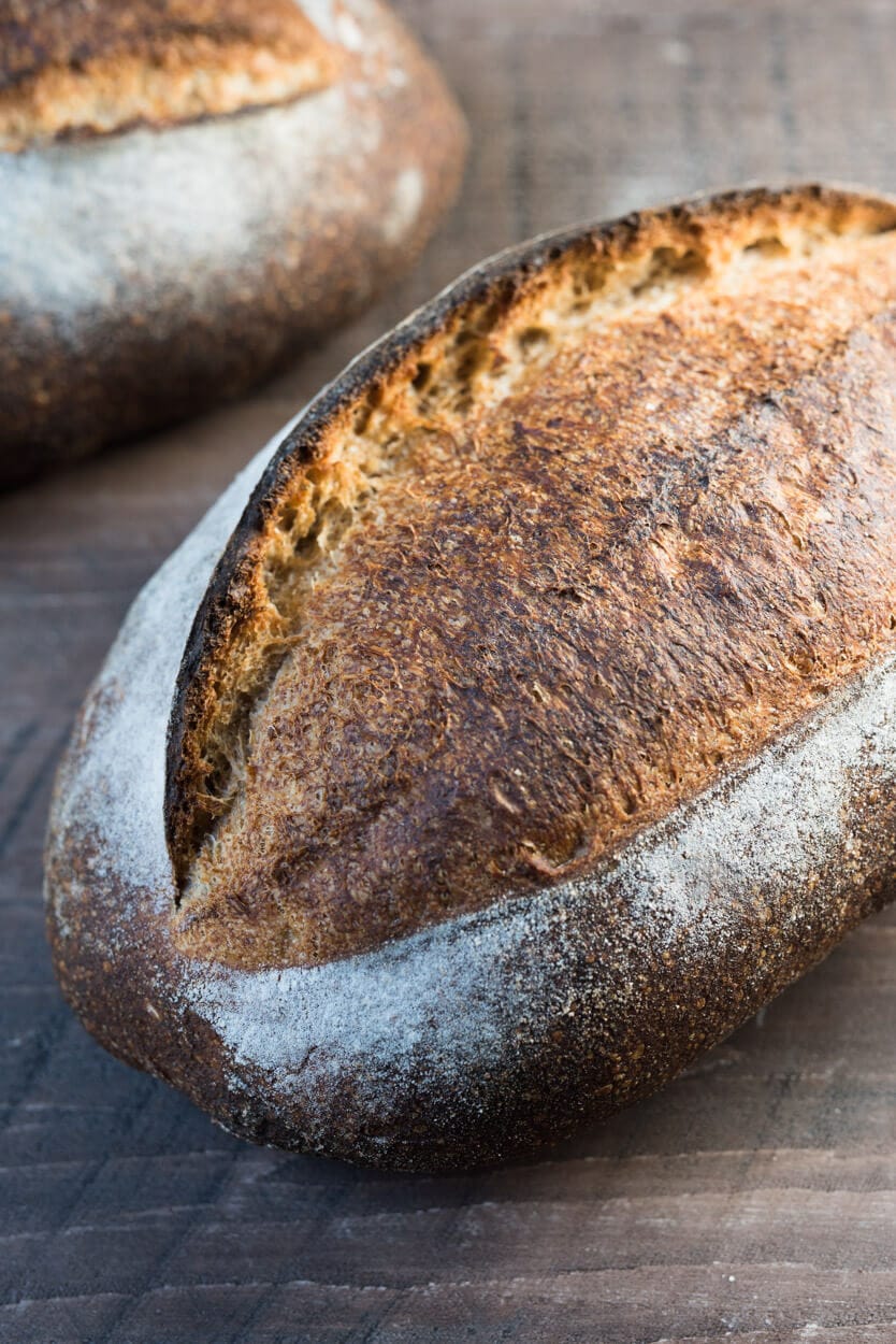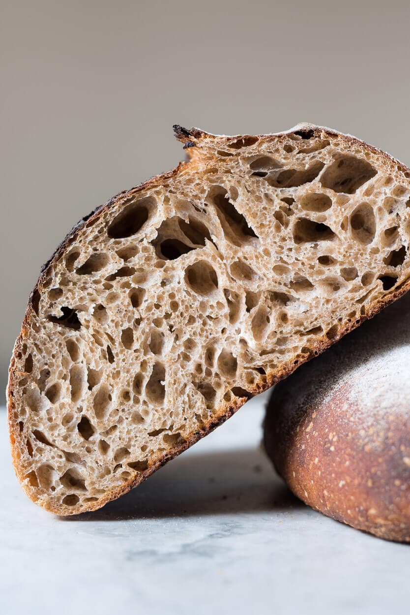 A delicious loaf of sourdough bread with 50% whole grains. This bread is airy, light in hand, and it has a deep, complex flavor profile from the assertive wheat and fermentation flavor.