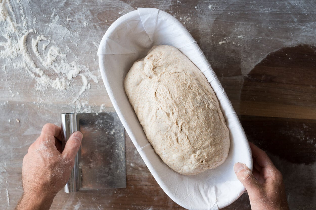 Moderately flour the top of the dough and flour the work surface. Flip one resting round over, so the floured side is down on the work surface. Fold the dough’s top up and over to the middle and repeat for the bottom (you’ll now have a long slender rectangle in front of you). Pickup the rectangle and rotate it 90º, so it’s now lengthwise facing you. Grab the dough at the very top and fold over a little way, press to seal with the dough’s central mass. Now grab this rolled over the top and gently continue to roll it down towards the bottom, tucking in the dough as you go (imagine rolling down a beach towel). At the end of this, you’ll have a tube that has essentially been rolled downward. Once shaped, transfer each to their floured shaping basket with the seam side facing up.