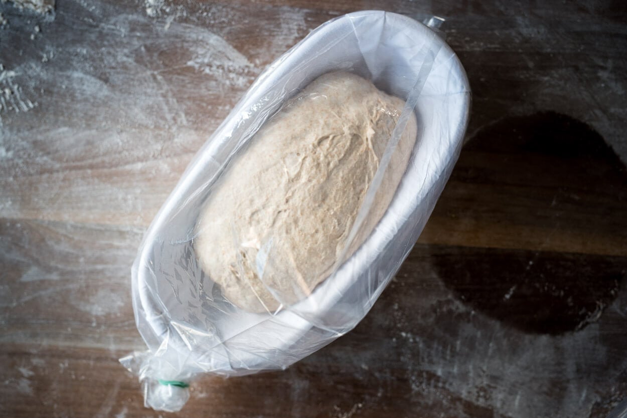 Cover your baskets with plastic and then place them in the refrigerator to proof at 39°F (4°C).