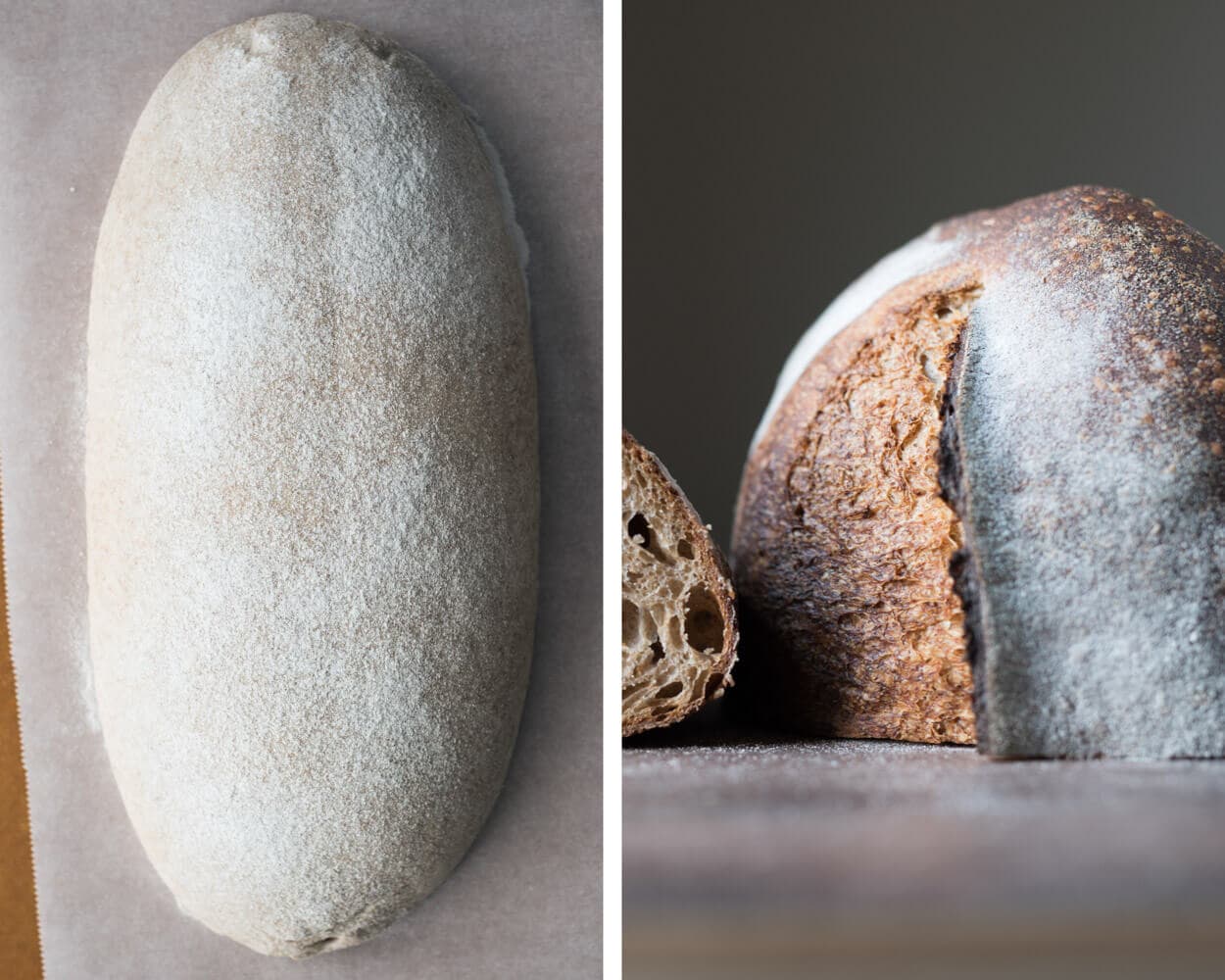 I almost always prefer the batard shape over a boule, mainly because of how the bread slices up (not too wide and a little taller), and this bread is no exception. I enjoy how the crust peels back as the bread opens in the oven. It contributes to that tall loaf with a really pleasing aesthetic.
