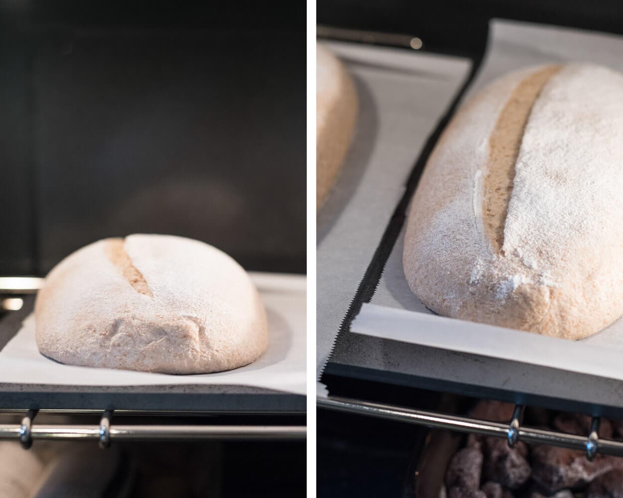 You’ll notice my dough has risen somewhat but not a significant amount. Instead, the dough has relaxed to fill my proofing baskets and is perhaps a little puffier (the loaf on the right was a slightly higher final dough weight and will result in a larger loaf).