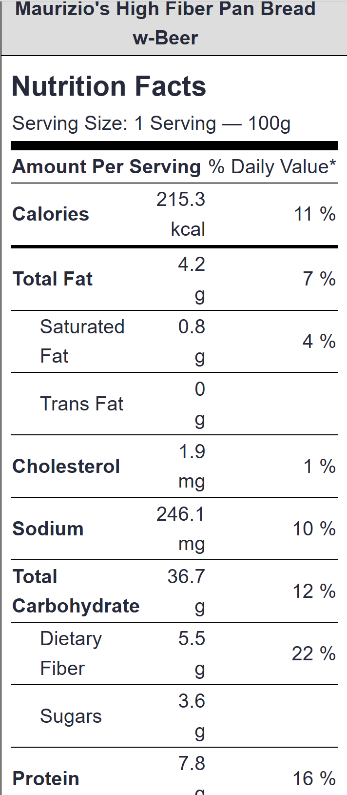 https://uploads.disquscdn.com/images/04d2873c48a3acad86822782375d75a39a2b6878e6db6c7409202a4a64ee279d.png This is a screen shot from my cronometer app for my version of his bread. I used beer, which increases the calories. 7.8g protein is pretty awesome, & 5.5g fiber is perfect as well.