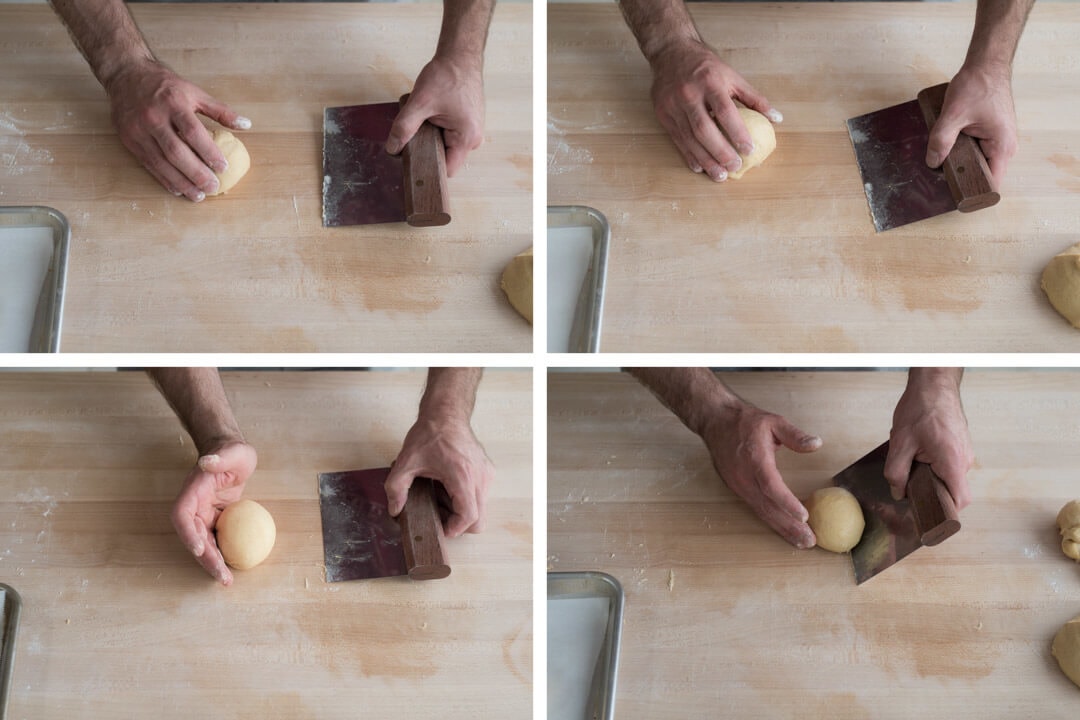 As you can see above, the process is simply taking a piece of divided dough, rounding it with your bench knife or hand, then pushing the dough against the work surface to create tension on the outside of the bun or roll.