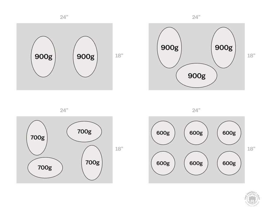 Ultimately, you want to maximize deck real estate to bake as many loaves as possible without them touching during baking (which will cause the dough to have pale, soft spots at the point of contact).