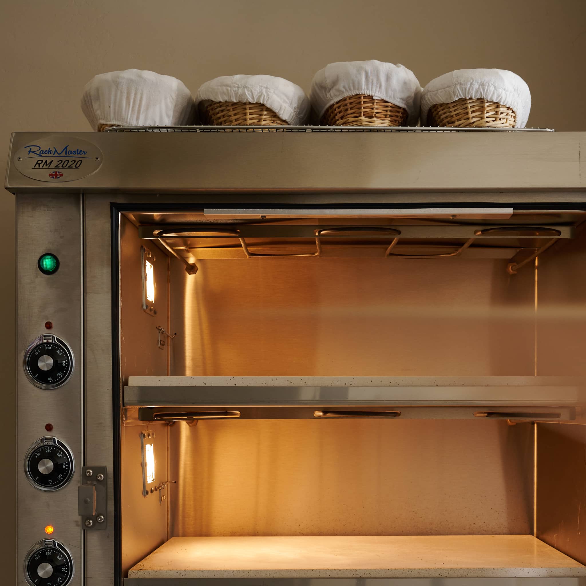 The top of the oven doesn’t get excessively hot, so there’s no worry about scorching the baskets, but if you’re concerned, place a metal cooling rack on top of the oven to hold your drying baskets or bannetons.