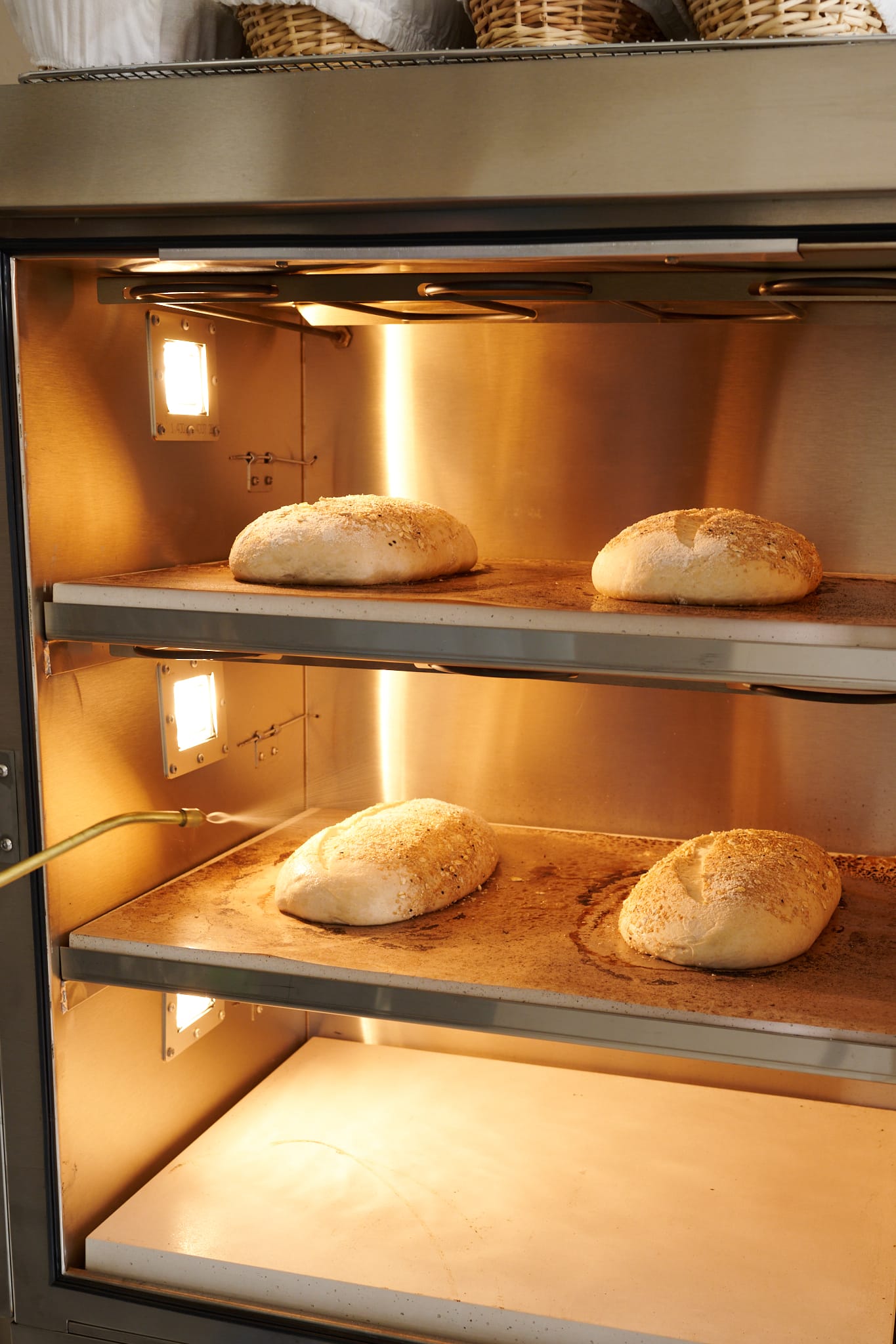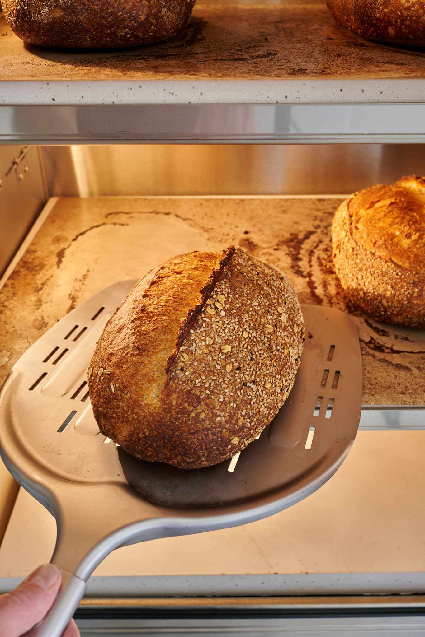 When the loaves are fully baked, remove them and the reusable baking sheets with a peel and let the bread cool on wire racks. If baking more bread, turn the dials back up to 250°C, close the steam vent, and let the oven return to temperature while you prepare more dough for baking.