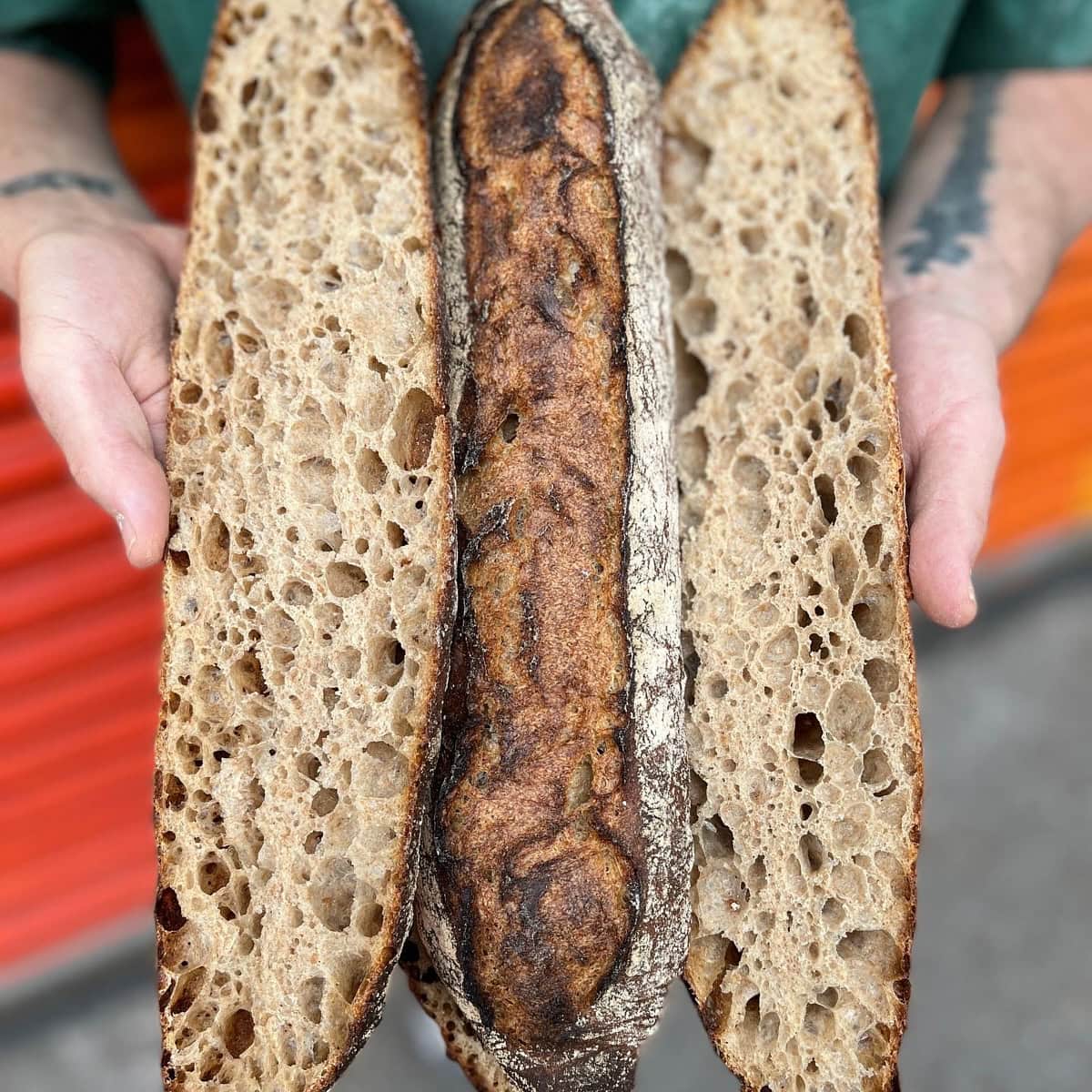 Start by slicing a thin piece of bread with a sharp serrated knife. Thin, like the width of a magazine’s spine. Please don’t start with the heel, and don’t slice bread that hasn’t completely cooled. (We want the starches in the bread to firmly set and settle before talking about fermentation’s flavors. This occurs, depending on the ambient air temperature, about three hours after the bake). Now, take your slice as if it’s an offering to some pagan god and put it under your nose. Then squeeze it, like you would a slice of lemon into a glass of water.
