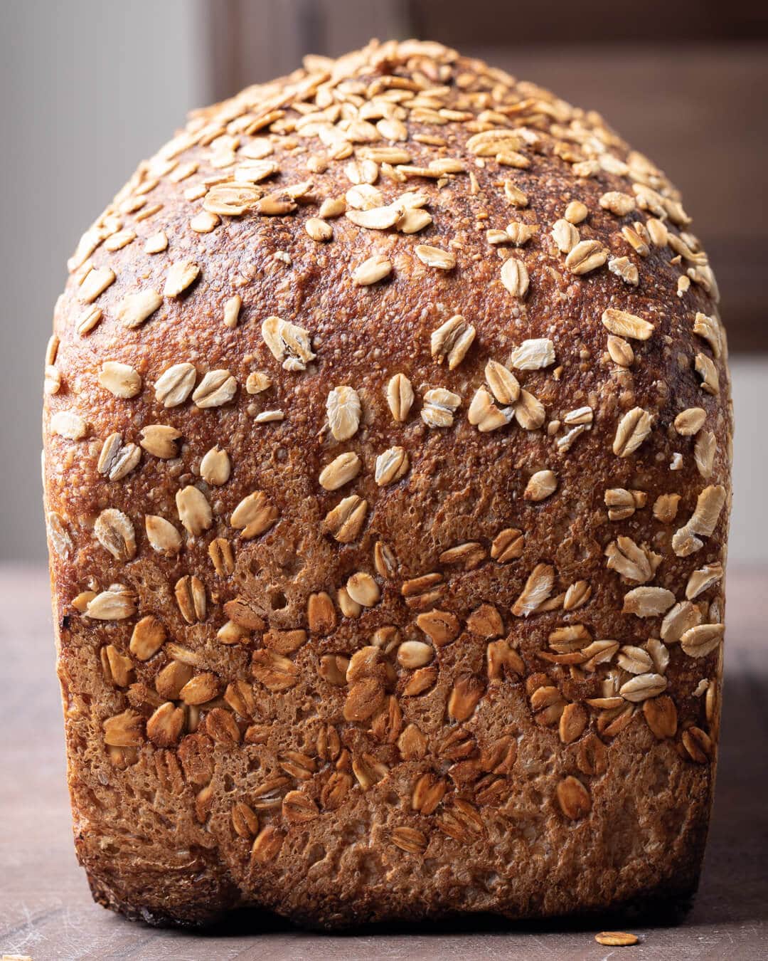 A splendid, gentle top curve from dough that’s proofed just enough. Just enough to still have “energy” to expand upward in the oven, but not so much that it causes an erratic fissure due to the lack of scoring. A balance. Add to that a striking exterior color from a bold bake, the enticing aroma from freshly milled flour, and a speckled oat topping—all contributing to a truly wonderful bread. But beyond all this, it’s one that’s meant to be eaten in thick slices carved from the loaf with a spread of soft butter, toasted and topped with fresh preserves, or used to cobble together a sandwich piled a little too high.