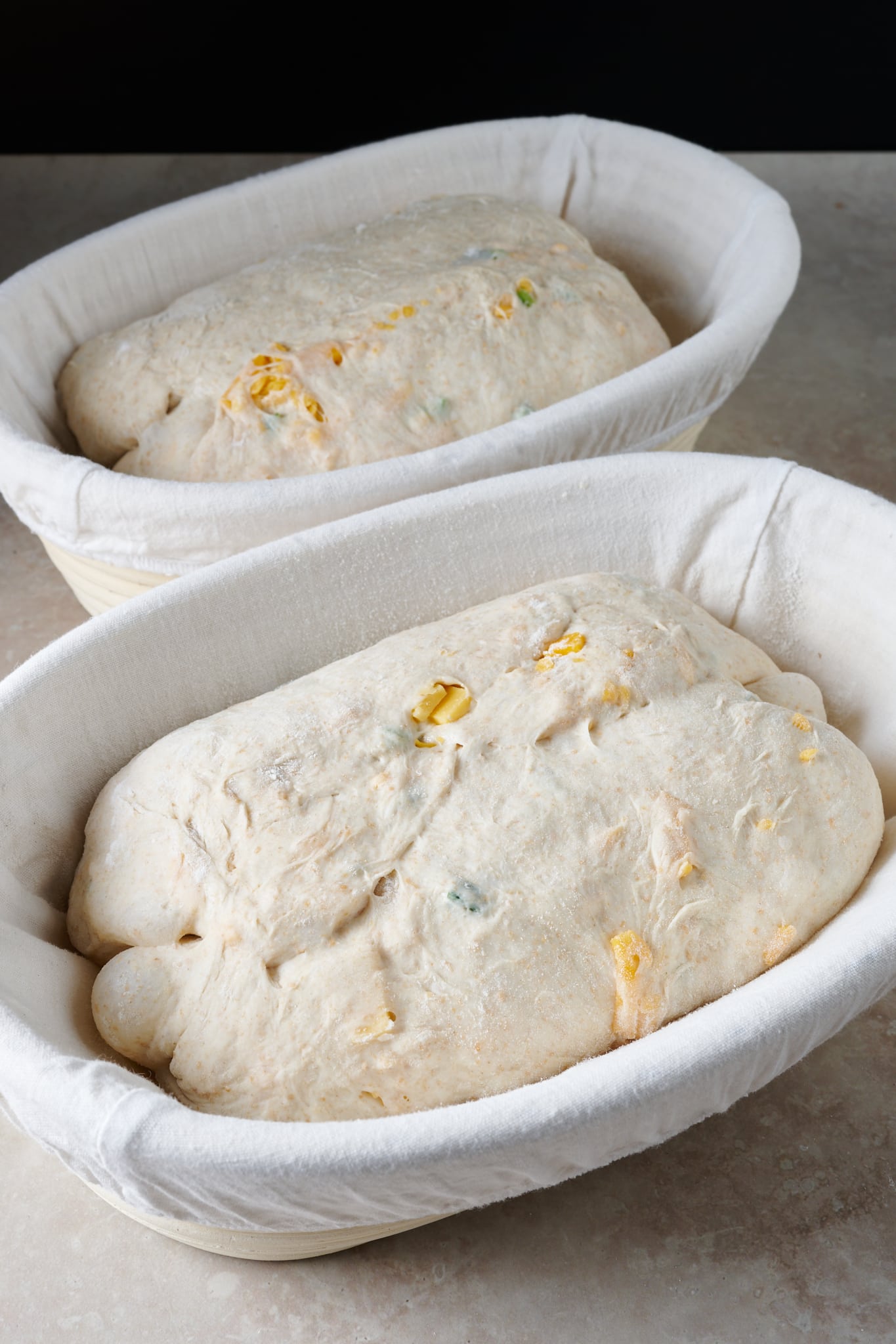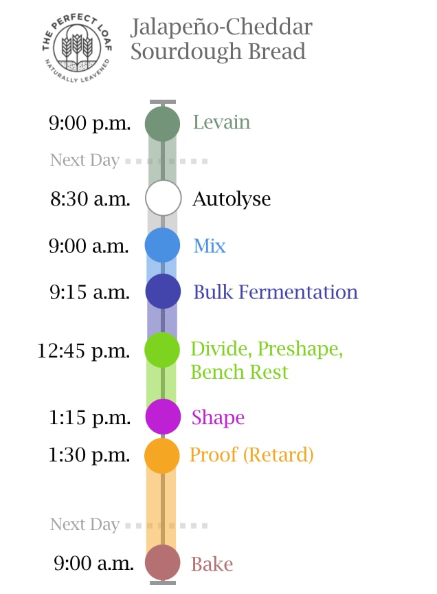 This jalapeño-cheddar sourdough bread is made over two days. Cold proofing this dough brings additional flavor, but you can always do a same-day bake. Instead of placing the shaped dough into the refrigerator to proof overnight (shape retarded), leave it covered for 1-3 hours (depending on kitchen temperatures, colder means longer) until ready to bake.