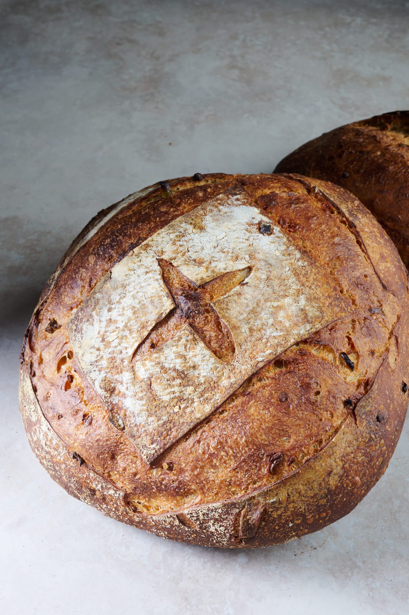 Score each piece of dough and slide it into the oven—bake for 20 minutes with steam. Then, remove the steaming pans from inside the oven (or remove the lid to your baking pan) and bake for an additional 30 minutes, or until the crust is deeply colored and the interior temperature registers around 204°F (95°C).