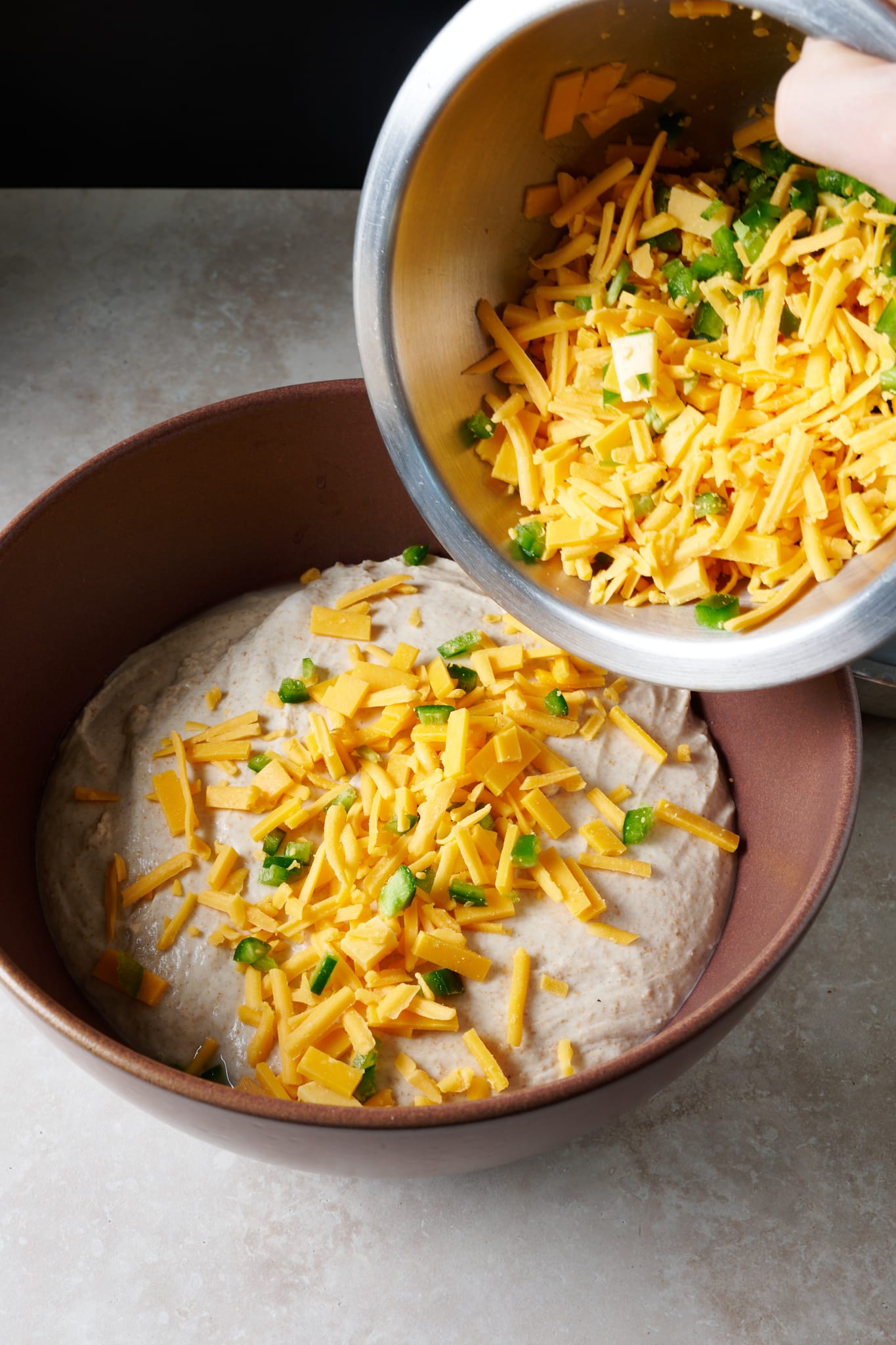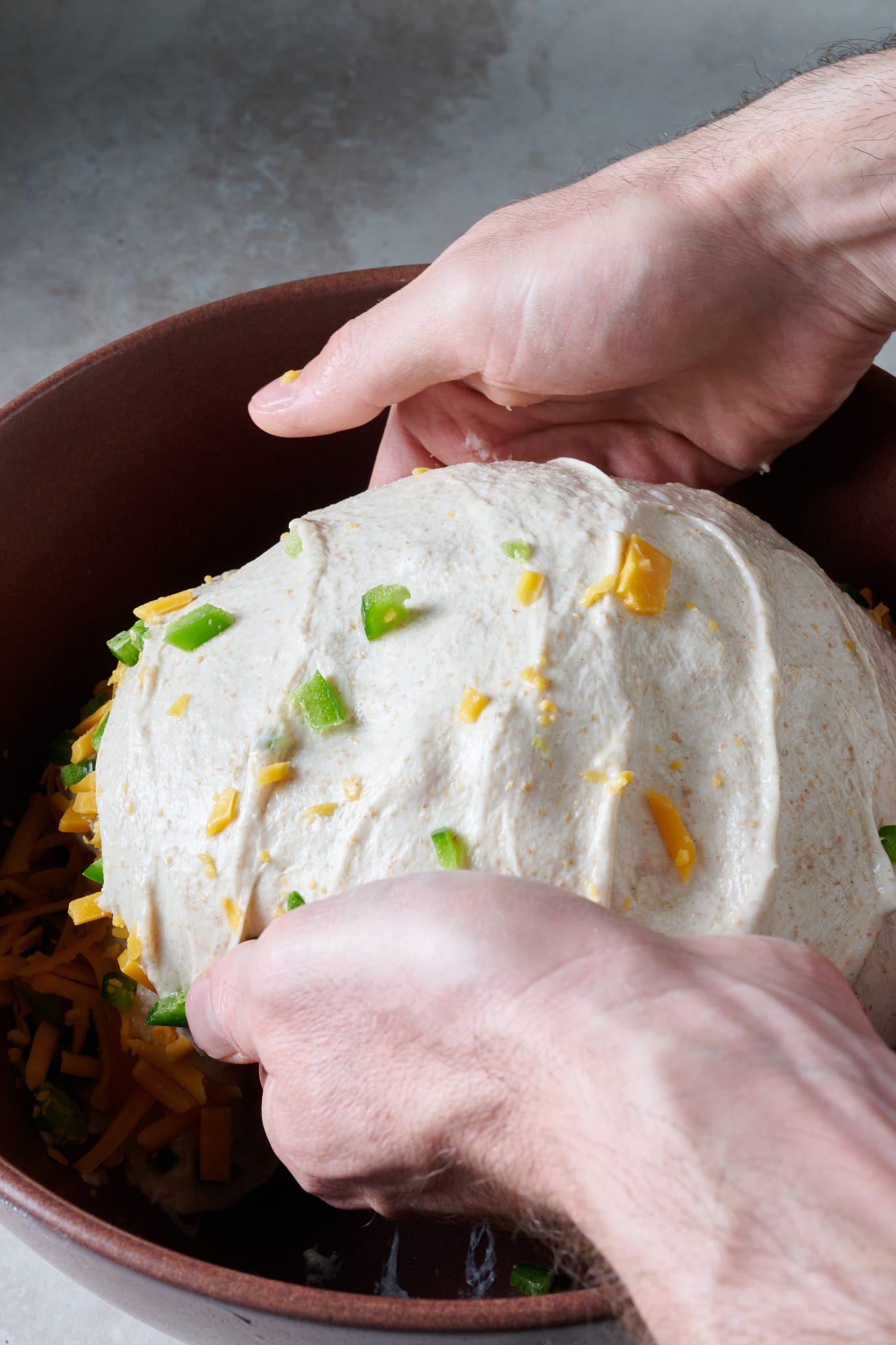 After the first thirty minutes into bulk fermentation, but before you give your dough its first set of stretches and folds, spread about 1/4 of the jalapeños and cheese over the top of the dough. Then, grab one side of the dough and stretch it up and over it to the other side. Next, spread on another 1/4 of the inclusions to the new top. Rotate the bowl 180° and perform another stretch and fold. Spread on another 1/4 of the inclusions, rotate the bowl 90° and do another stretch and fold. Finally, spread on the last of the peppers and cheese, turn the bowl 180°, and do one last stretch and fold.