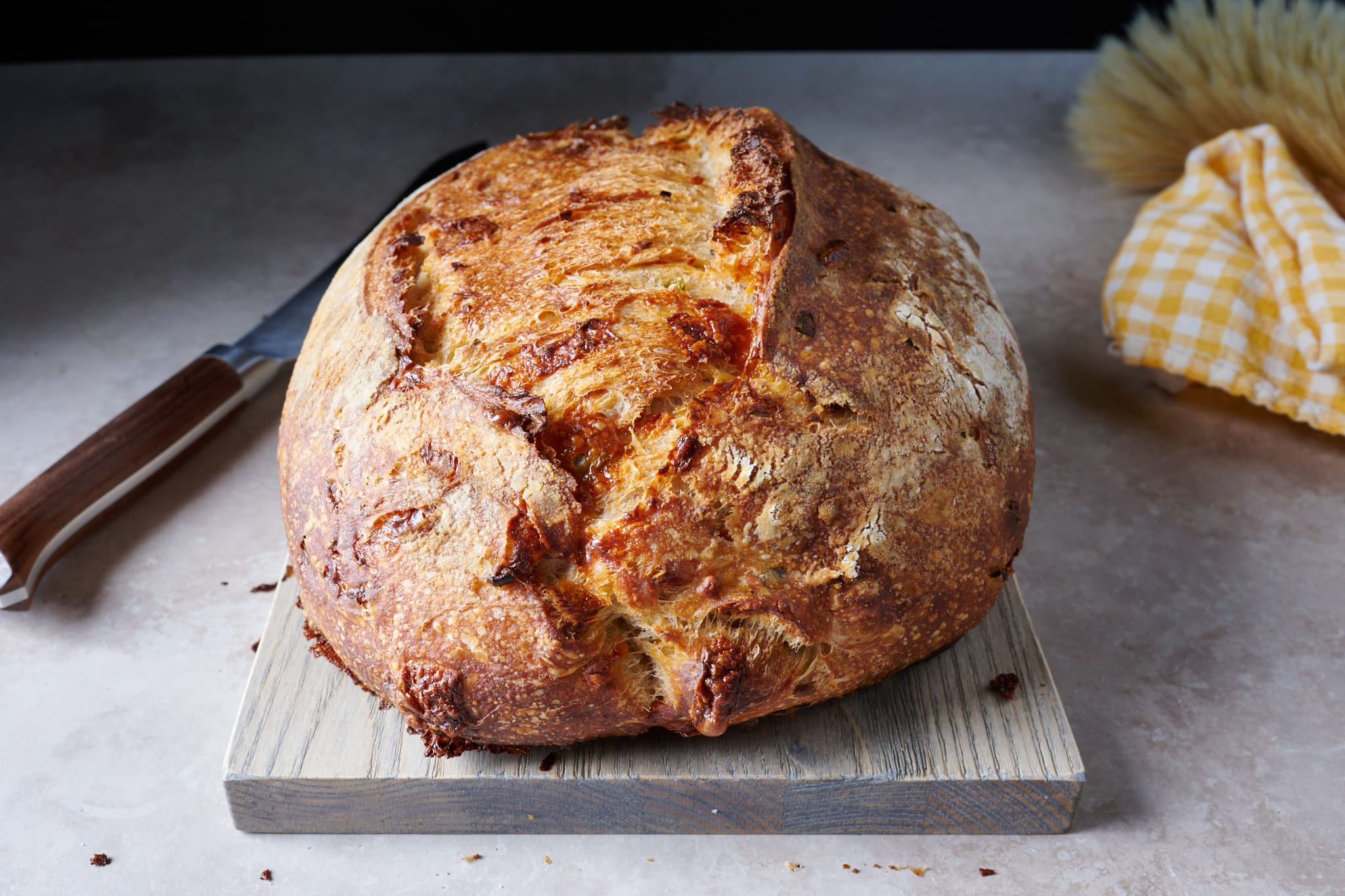 Preheat your oven with a baking surface or combo cooker/Dutch oven inside to 450°F (230°C).I recommend baking this dough on a piece of parchment as the cheese might melt out slightly. When the oven is preheated, remove your dough from the fridge, score it, and transfer it to the preheated baking surface or combo cooker. Bake for 20 minutes with steam. After this time, vent the steam in the oven or remove the lid (you can keep it in the oven or remove it) and continue to bake for 30 minutes longer. When done, the internal temperature should be around 204°F (95°C).