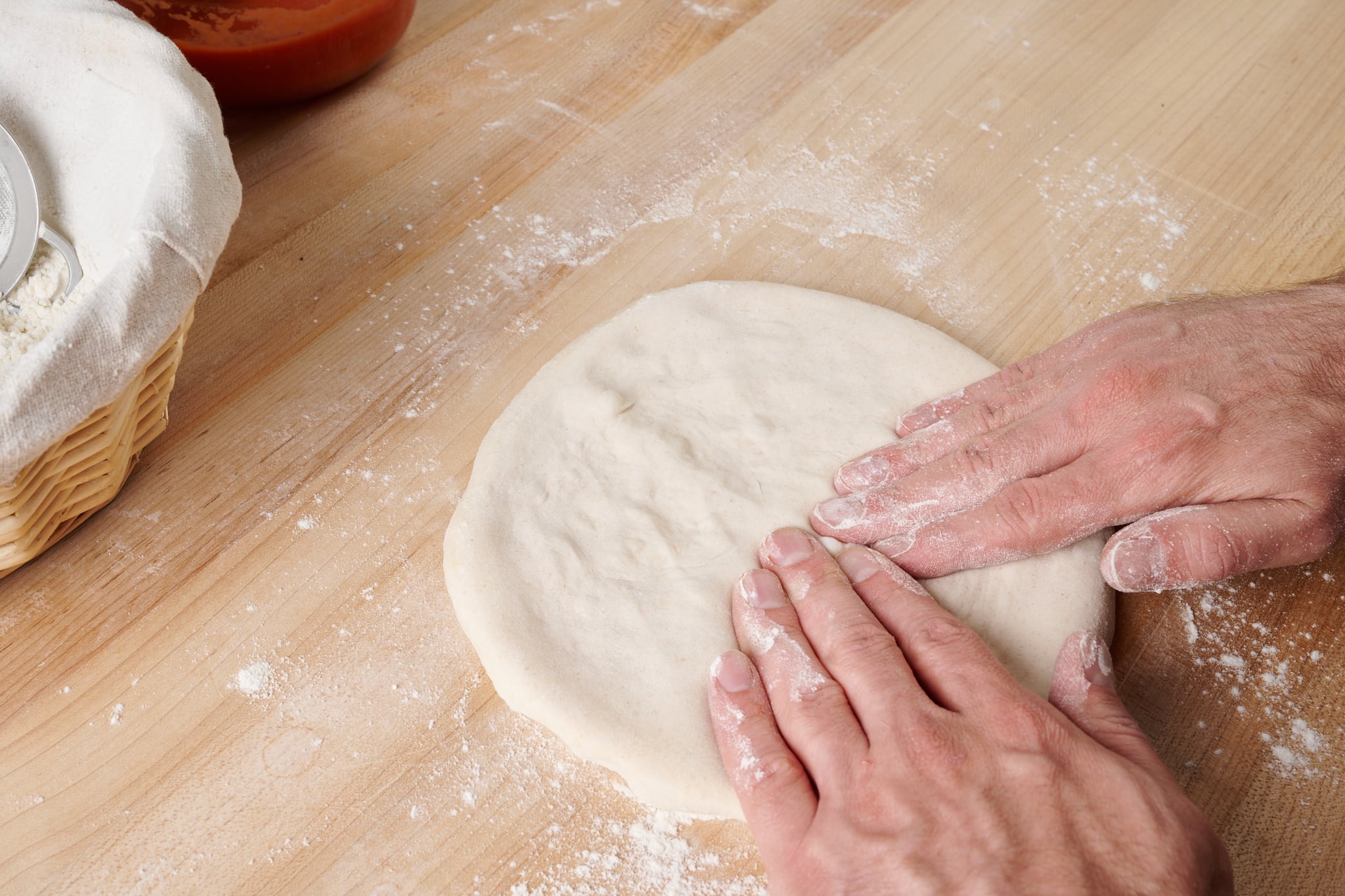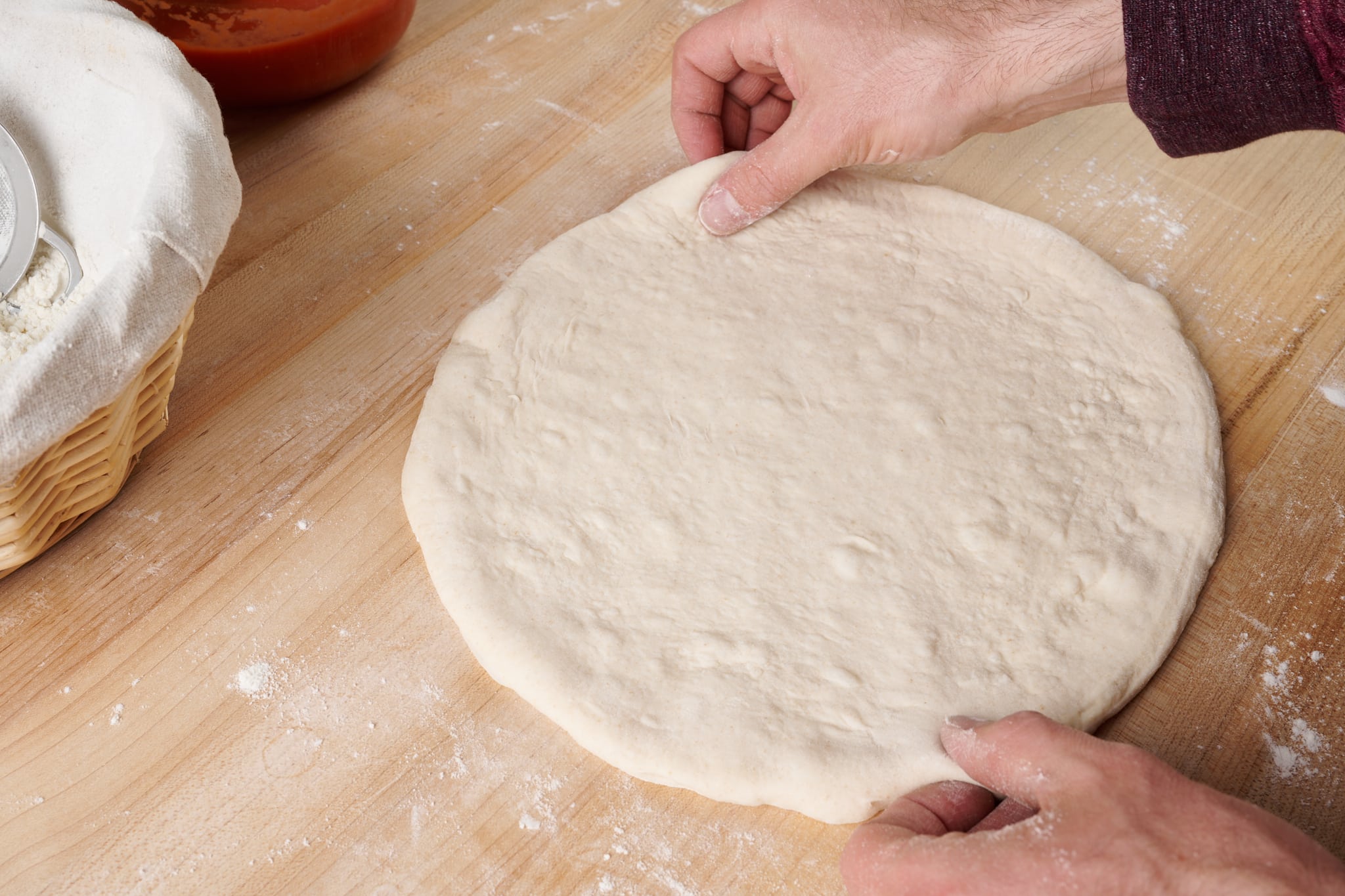 Stretching pizza dough is the process of taking a shaped dough ball and stretching it out into a large circle that’s then topped with sauce and other toppings such as cheese and then cooked. There are many ways to stretch pizza dough, from pressing it out with your hands on the work surface, slapping the dough out to shape (typical with Neapolitan style pizza dough), to stretching it in the air with the backs of your hands.