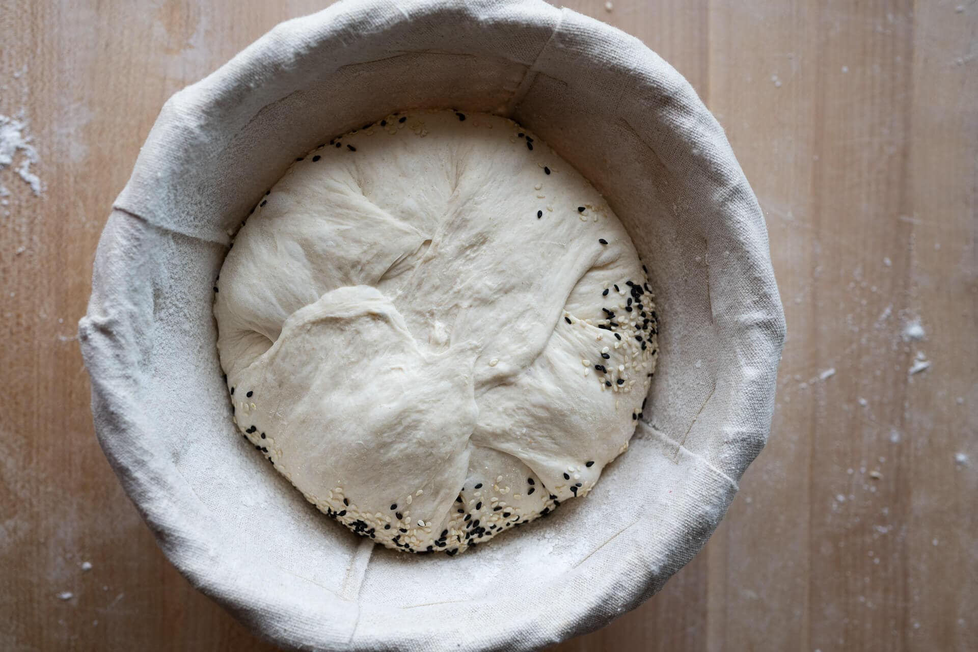 I went an extra step with this dough and coated it with a mixture of black and white sesame seeds for flavor. You can omit toppings altogether or use sesame as I did, rolled oats, flaked barley, pumpkin seeds, or anything you think would taste wonderfully toasted in the oven. Lay a towel next to your work surface and spread the topping out thinly. After you shape the dough, roll the smooth side on the towel to pick up these toppings (as shown in the video below).