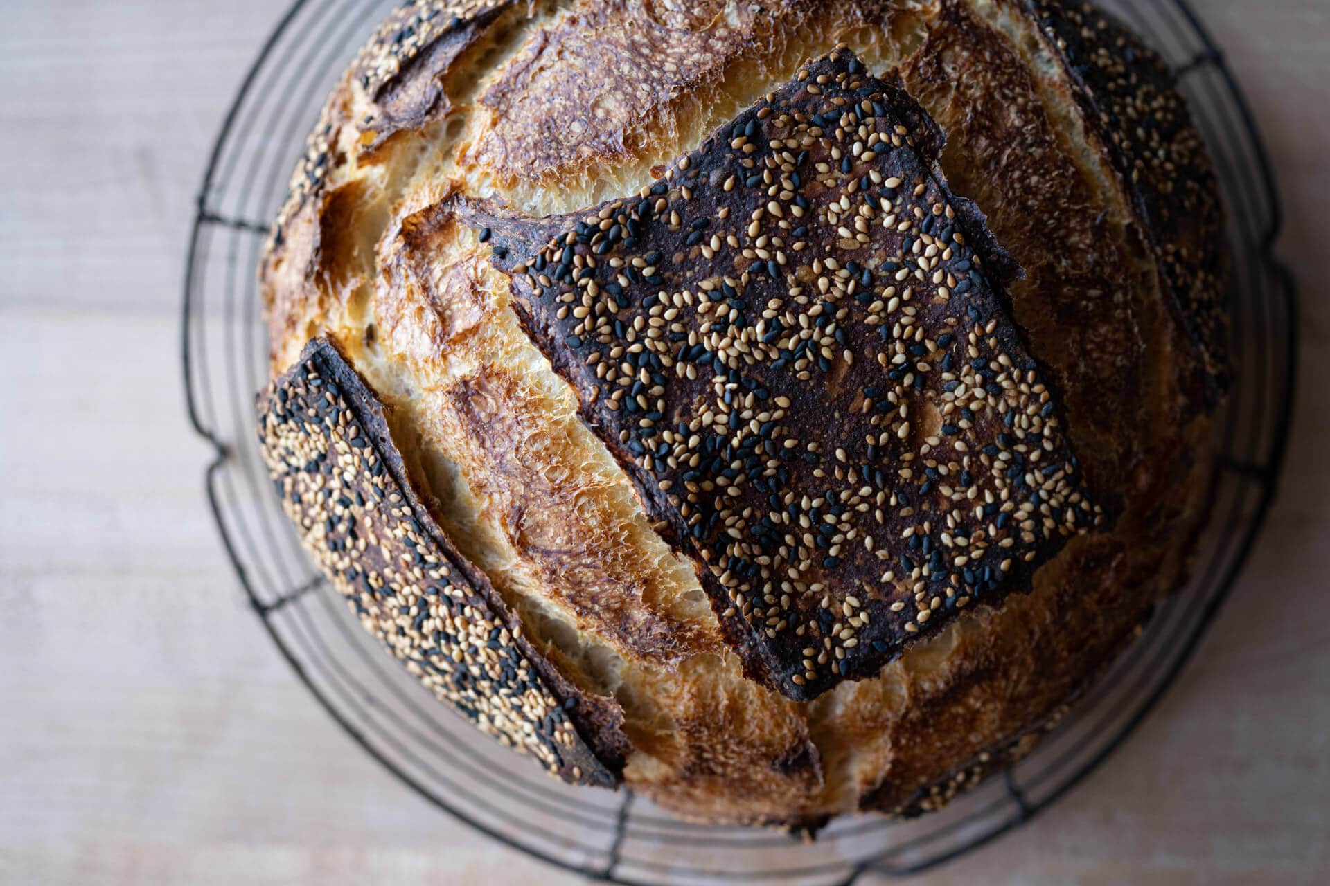 The crust was a rugged one, something I don’t mind one bit. The variegated colors from the sesame add some visual interest—not to mention tons of umami—but the color on the crust would be enough to satisfy my visual appetite. And the crust itself has all the appreciable crunch I look for in one of my sourdough loaves. And perhaps most importantly, the crust tastes incredible dipped in some olive oil—this has me yearning for the middle of summer when tomatoes will be ready in the garden.