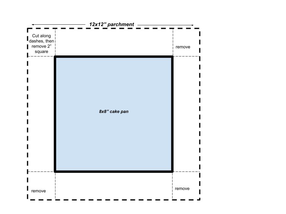 To perfectly fit a piece of parchment into an 8×8-inch pan, cut a piece of parchment into a 12×12-inch square. Place the greased pan on top of the parchment as a guide if you’d like, then use scissors to cut out a 2-inch square from each corner of the parchment. Press the parchment into the greased pan: the removed corners will fold in perfectly. For a visual, see the below guideline.
