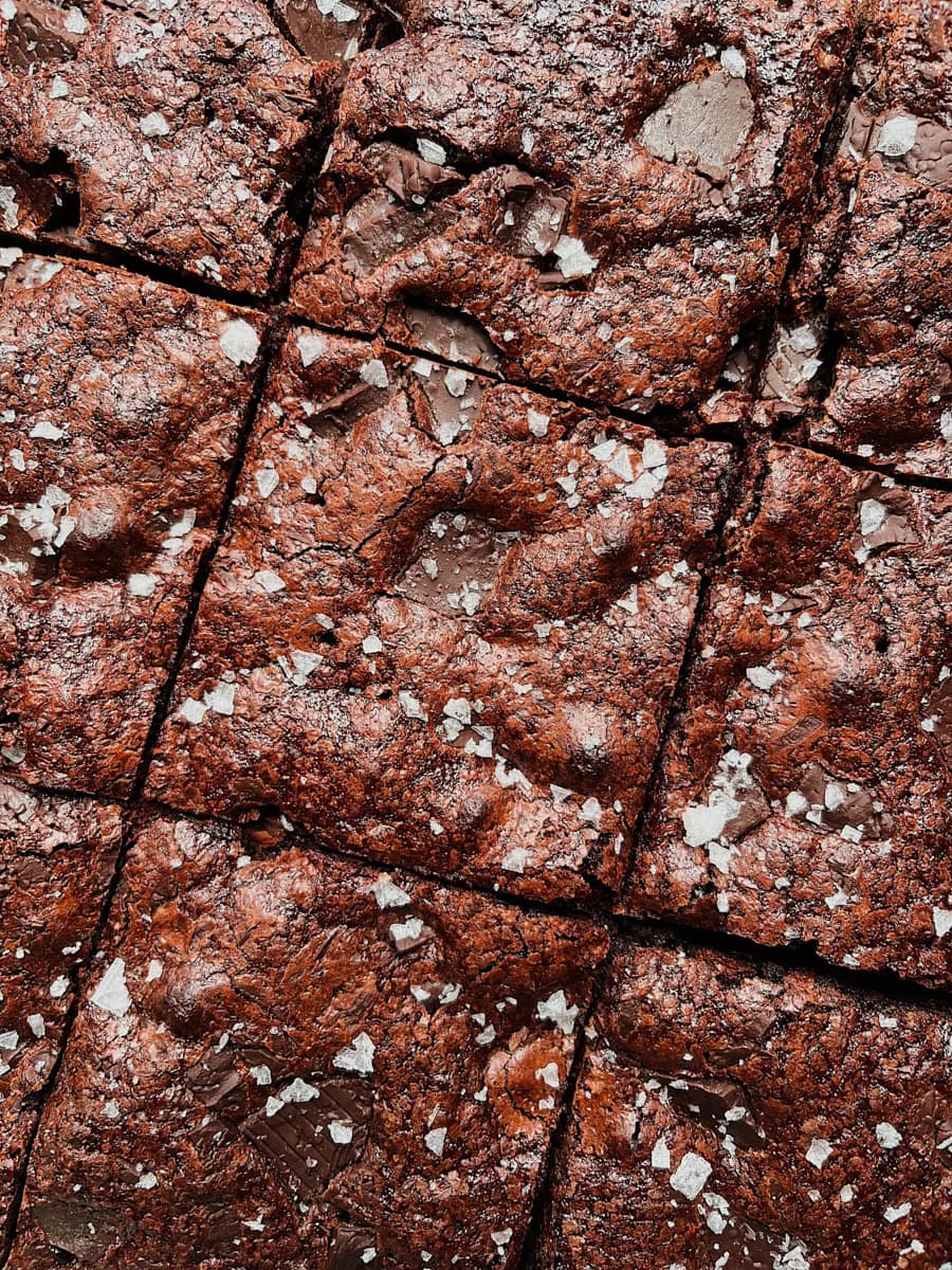 5. Lift the brownies out of the pan by the parchment and place on a cutting board. Cut into pieces (I like cutting the batch into 9 large, 12 medium, or 16 bite-sized pieces). Brownies will keep in an airtight container at room temperature for up to 5 days, in the fridge for up to 10 days (I love cold brownies, this is my preference), or in the freezer for up to 4 months.