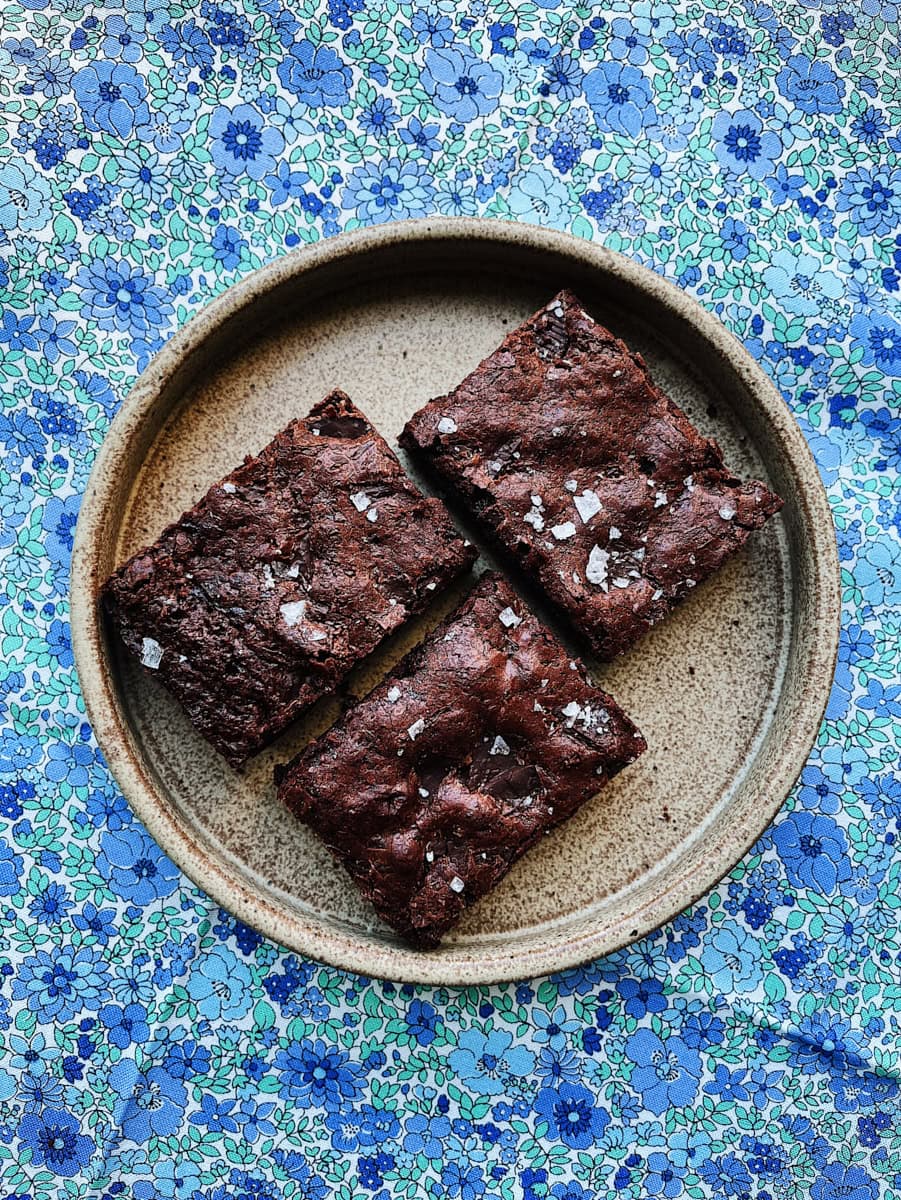 Fudgy sourdough discard brownies served on a plate