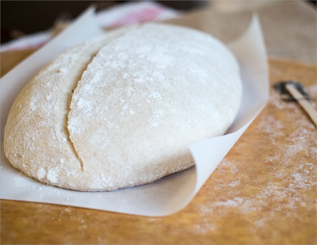 Take one of your loaves out of the fridge, cut a piece of parchment paper and place on top of the basket. I then place a the pizza peel on top of the parchment paper (and basket) and invert the whole thing quickly to get the dough out of the bowl and onto the paper and peel.