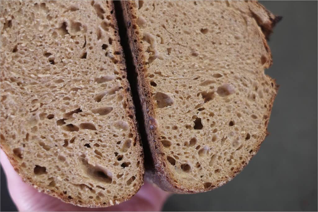 High rise on these two! Each slice is open and airy with an excellent level of tenderness. At 95% hydration, a moist crumb is to be expected but I think this might be pushing the hydration levels, more water would not help this achieve anything further. Plus, pushing hydration more than 95% exits my shaping comfort zone as its very hard to handle (I’ve done a 115% hydration loaf, and I thought I was going to end up pitching the entire batch it was so difficult).