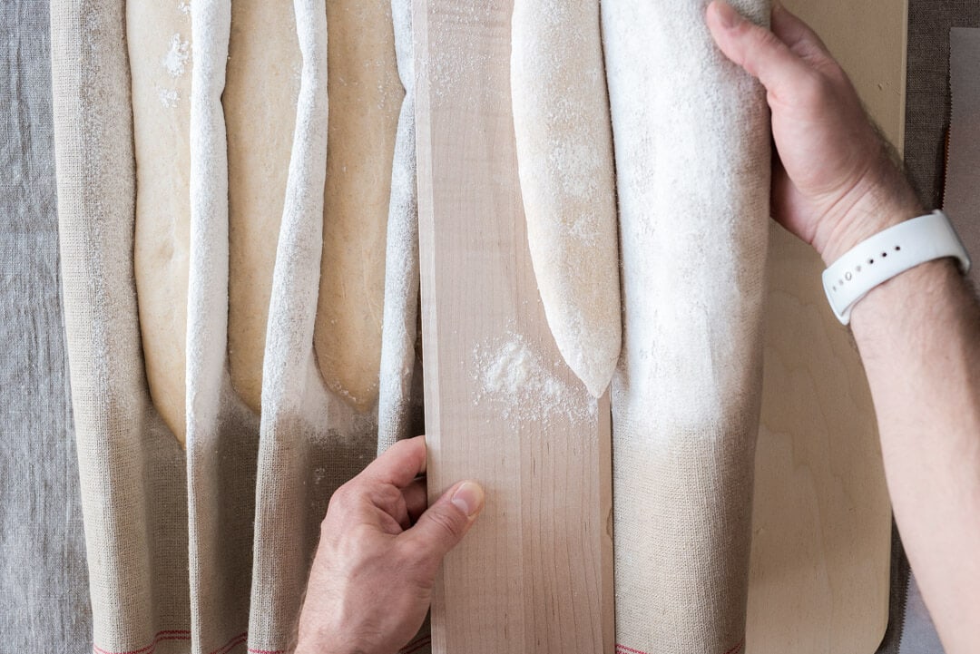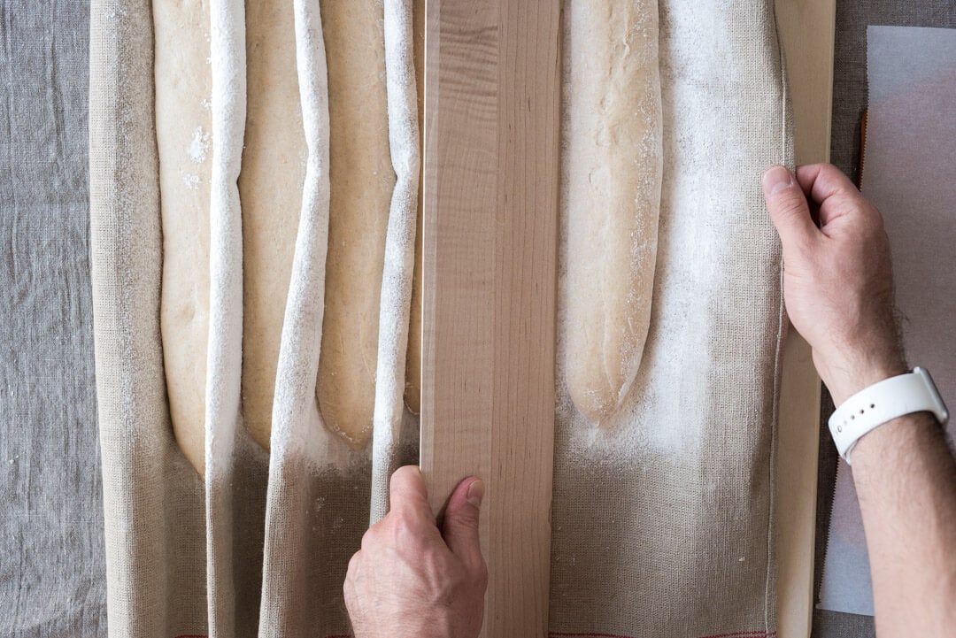 Grab the right end of the couche and pull it out, so the piece of dough moves away from the rest. Then, using a dough transfer board (a smaller pizza peel or a small cutting board could also work), place the board to the inside of the baguette (the side closest the rest of the dough pieces). With the hand holding the couche, quickly flip the dough onto the peel by tugging up and slightly over the transfer board. The baguette should now be seam side down on the transfer board.