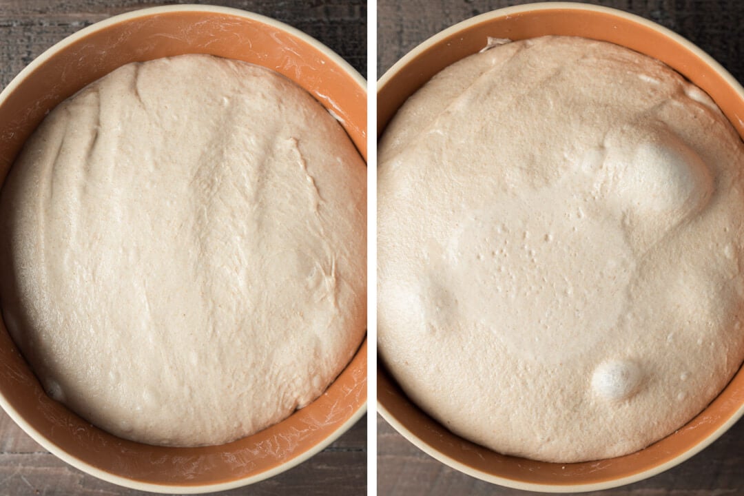 The image above shows my dough at the end of the warm bulk (left) and after pulling the dough out the next day after the cold bulk (right). Even though the dough was in the fridge, you can still see plenty of rise and activity in the dough. Note that in the right image above, the area in the middle pushed up and pressed against the plastic wrap.