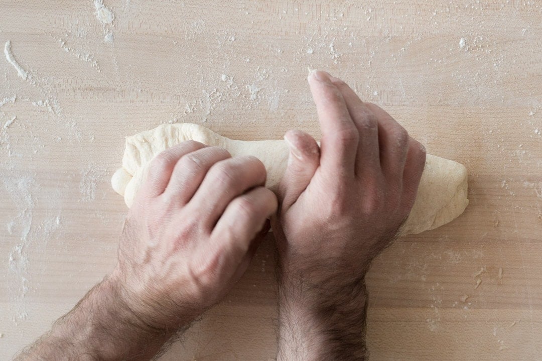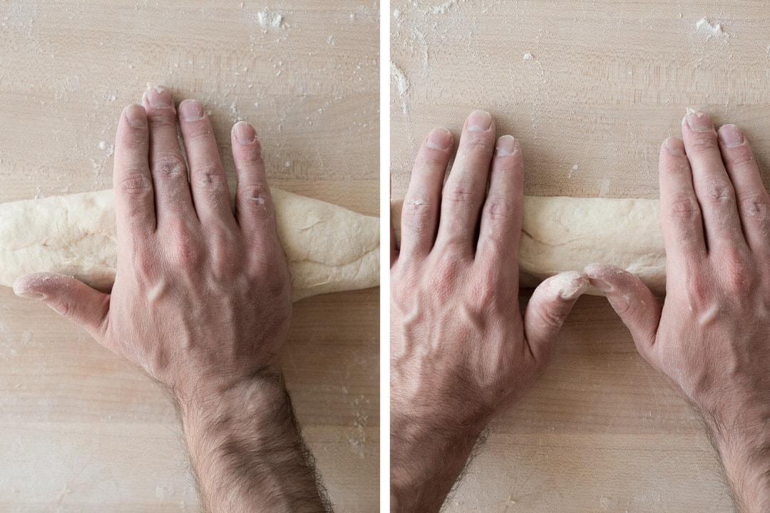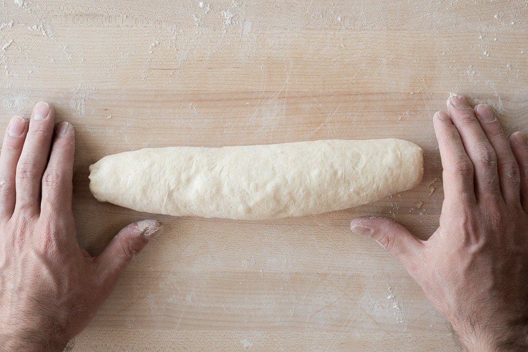 - Using one hand, start rolling the dough away and toward your body in the middle, then transition to two hands and roll the dough back and forth as evenly as possible until you reach the desired length. Note that during this rolling it’s best to keep your fingertips and palms in contact with the bench at all times
