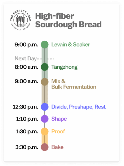 This high-fiber sourdough bread is made all in a single day, except for the overnight levain and seed soaker. The night before you want to bake these loaves, prepare the levain when your sourdough starter is ripe, and make the seed and oat soaker simultaneously. The next day, mix the dough when the levain is ripe, ferment it throughout the day, then bake it in the later afternoon or evening.
