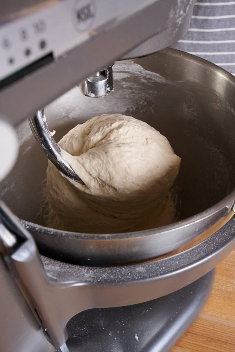 Return the mixer to medium speed and mix for 3 to 4 minutes until the dough gains more strength and clings again to the dough hook. The dough will still be sticky to the touch and might be attached to the bottom of the bowl, but the sides will be clean (see image below).