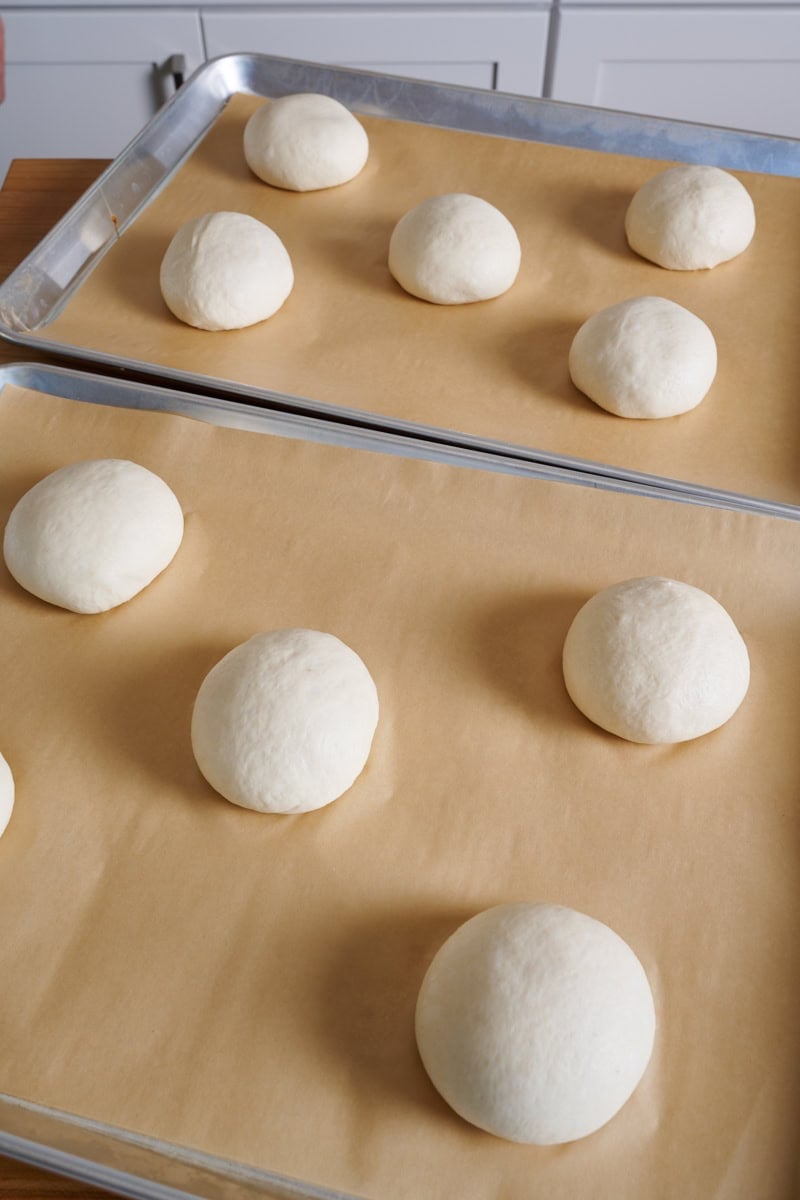 Line two baking sheets with parchment paper. Lightly flour your work surface, and using a bowl scraper, gently scoop the dough out to the floured area. Lightly flour the top of the dough and divide it into 10 (135-gram) portions. You might have a small bit of scrap dough left over.