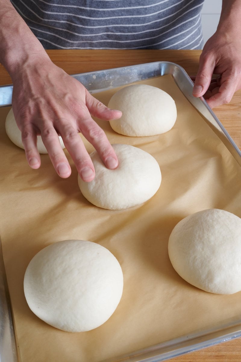 Line two baking sheets with parchment paper. Lightly flour your work surface, and using a bowl scraper, gently scoop the dough out to the floured area. Lightly flour the top of the dough and divide it into 10 (135-gram) portions. You might have a small bit of scrap dough left over. Using floured hands and a bench scraper, shape the portions into tight balls. - Proof – 2:00 p.m. to 4:30 p.m.