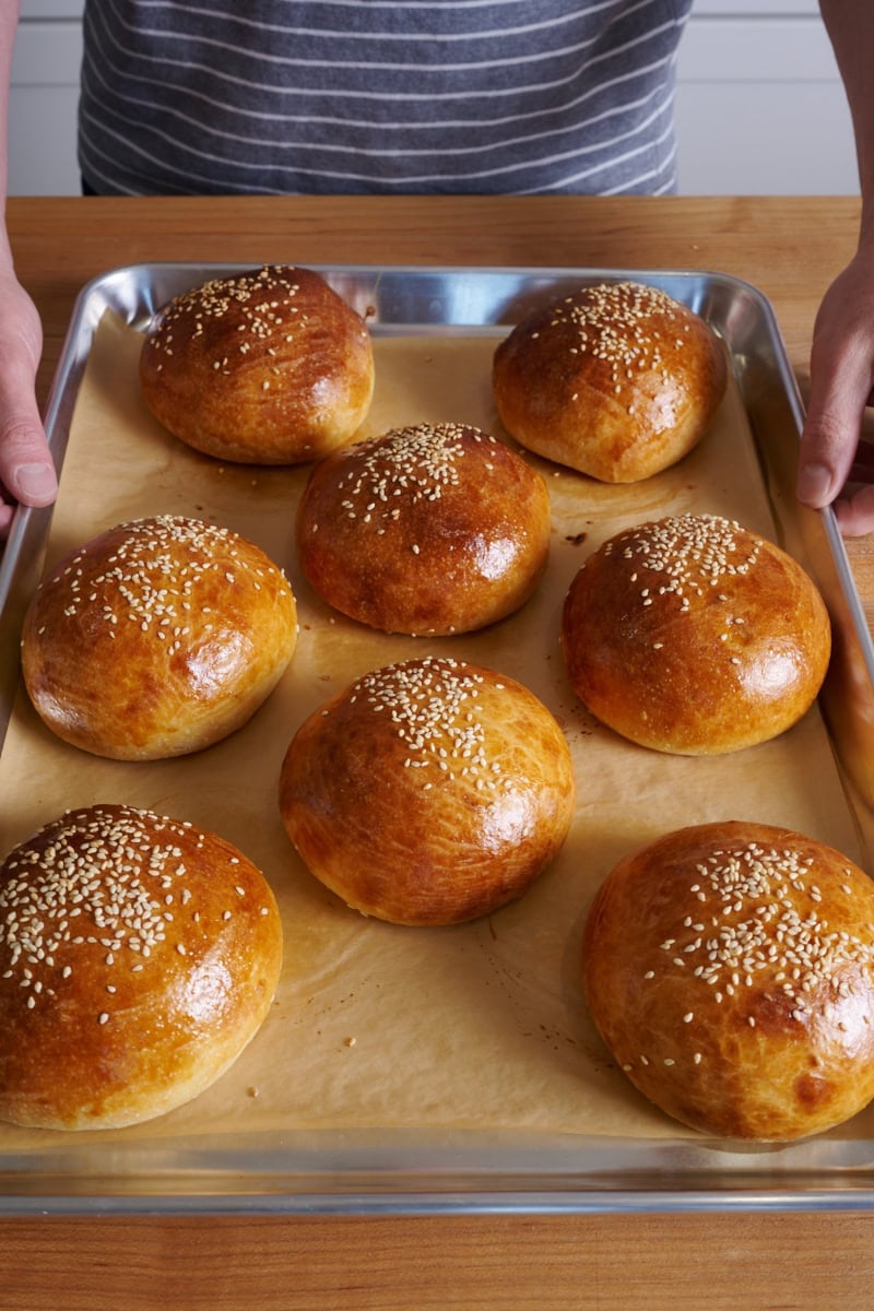 These milk bread hamburger buns take inspiration from Japanese milk bread (shokupan): They have a bit of sugar, lots of milk, and use the tangzhong technique to amplify the softness and shelf life.