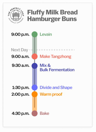 These sourdough milk bread hamburger buns are made over the course of a single day (aside from the overnight levain). This preferred fermentation schedule ensures the mildest flavor profile possible. It also makes for a convenient schedule: Mix the sweet levain the night before, mix the dough in the morning, and have hamburger buns ready for the evening.