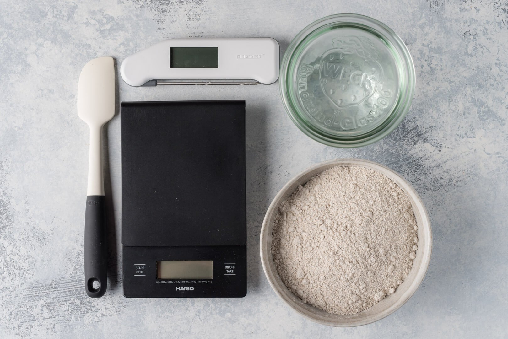 A kitchen scale is indispensable and guarantees accuracy when measuring the amount of flour needed for each starter refreshment. Measuring flour by volume is inherently imprecise as the amount of flour packed into a measuring cup can vary. Further, it’s a good idea to get used to using a scale for weighing ingredients, as this method is essential for improving your baking consistency.
