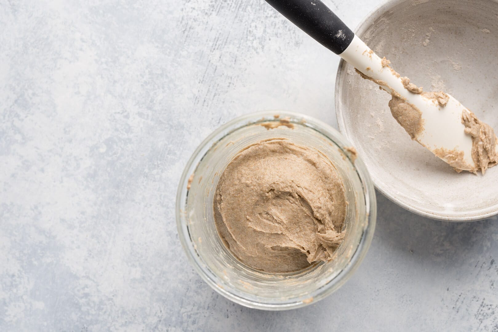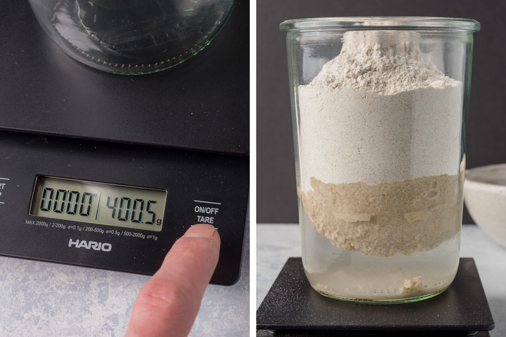 2. Place a clean jar on your scale and scoop in some portion (outlined below) from the jar you just stirred down