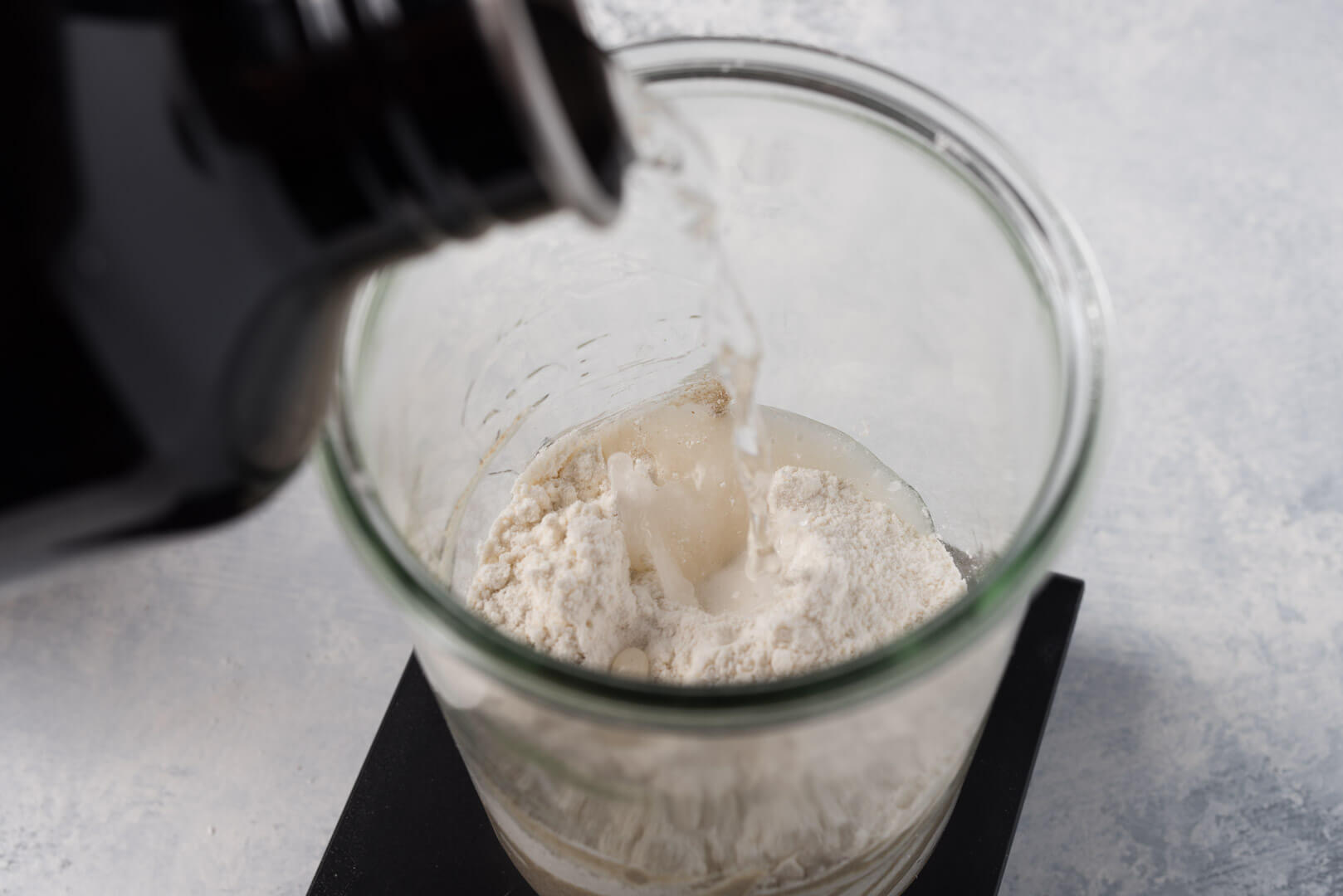 After you mix the flour and water in the jar, be sure to keep the jar lightly covered during the rest of the process. Either a porous cloth or a lid resting on top of the jar will work well. Use a container with enough headspace for the mixture to rise—I like to give at least 5-inches of headspace. Additionally, it’s a good idea to place your jar in a bowl while it’s resting in case the mixture overflows.