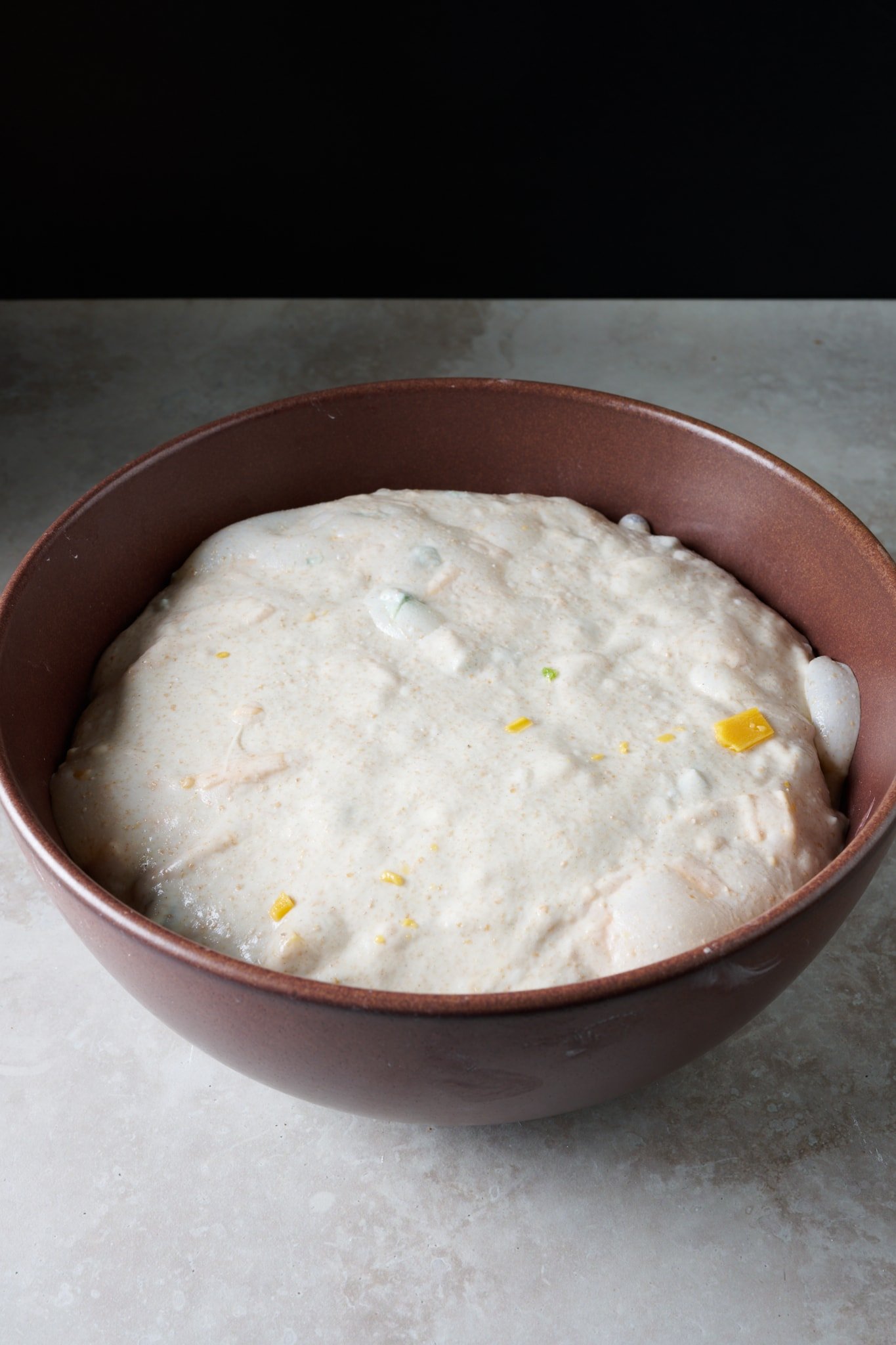 The jalapeño-cheddar dough at end of bulk fermentation.
