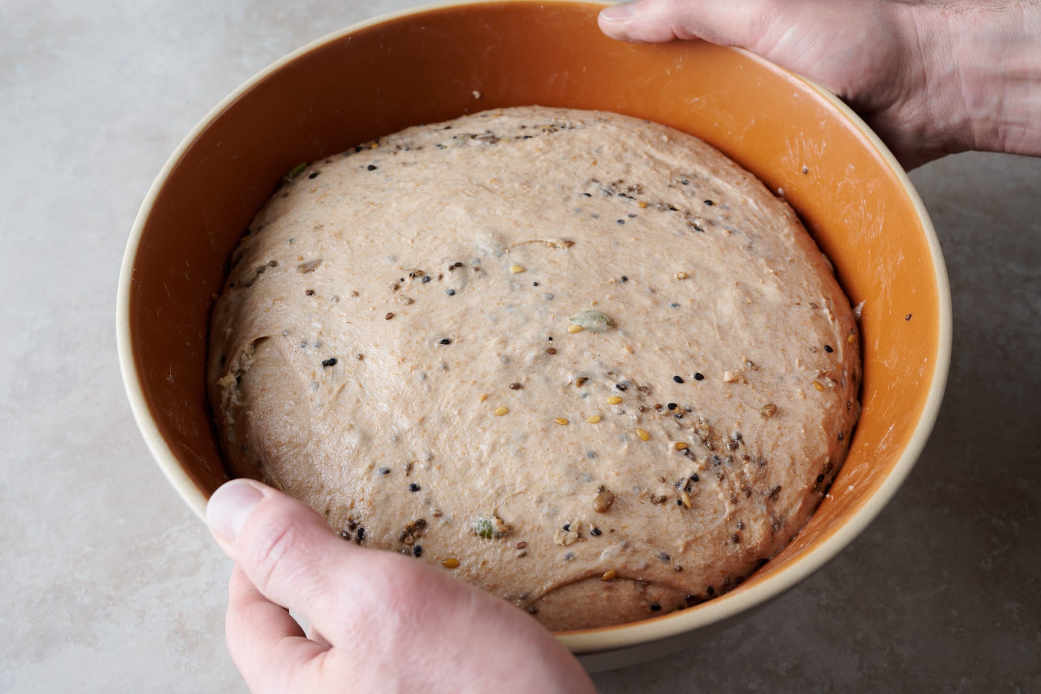 Seeded sourdough bread dough at end of bulk fermentation.