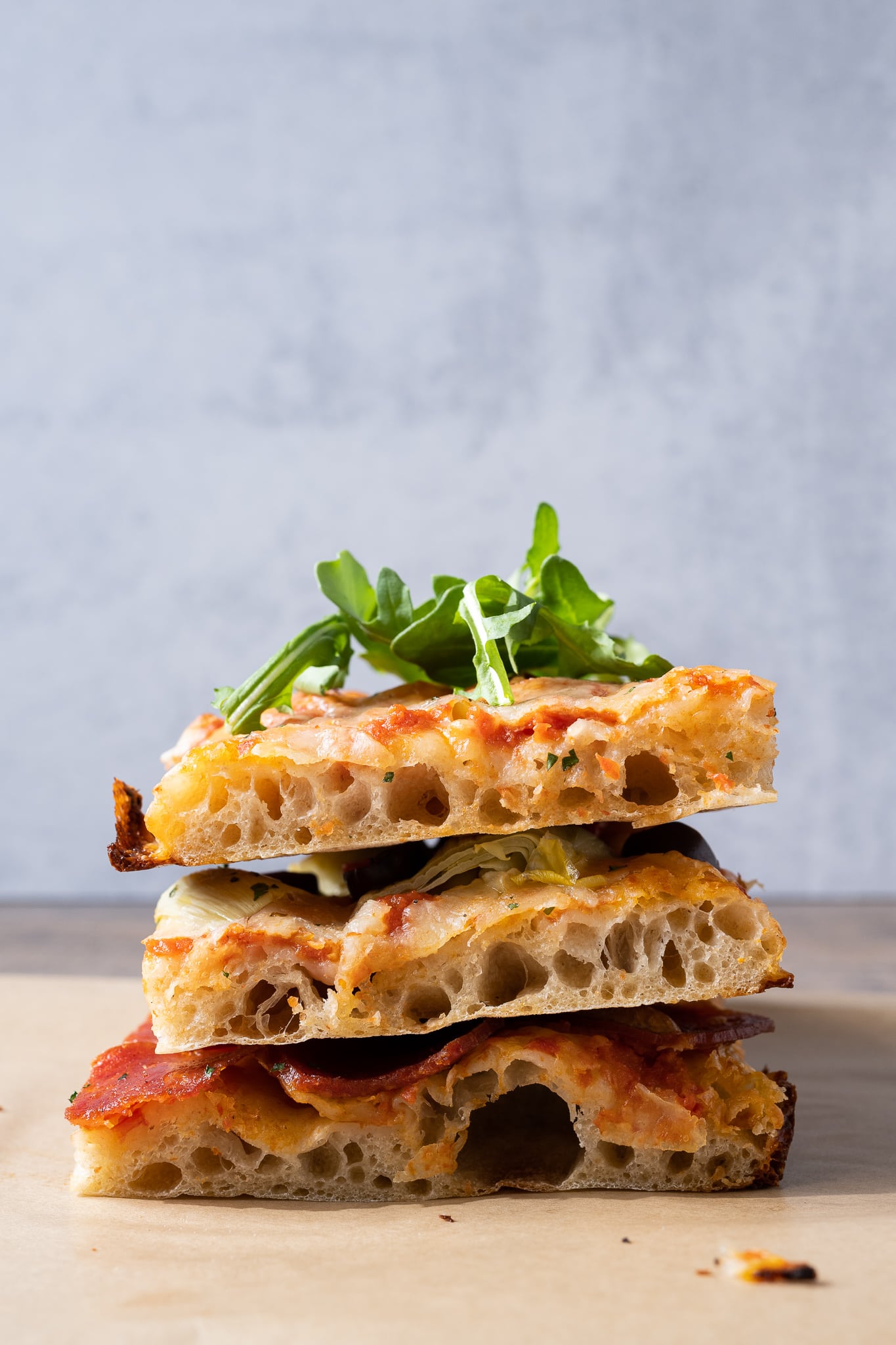 And I’ll come right out and say it: this sourdough pizza al taglio has been stealing the pizza spotlight for so long I’ve all but forgotten how to shape dough round-like instead of rectangular-like. The balance will likely shift once warmer weather comes, but regardless, there’s a permanent, well-deserved spot in my pizza repertoire for this style of pizza. Since I started making rectangular pizzas in a sheet pan, I’ve been hooked on its simplicity and deliciousness. It results in a pizza with a thin and crispy bottom crust, a tender interior, and an overall lightness thanks to strong fermentation and high water content—a perfect contrast of textures.