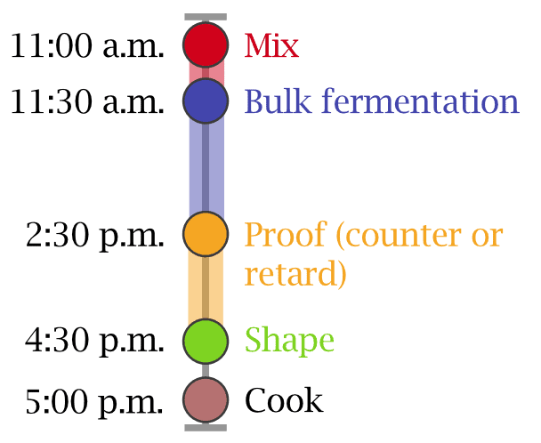 Give the dough 3 sets of stretch and folds during this time at 30-minute intervals. After the last set, let the dough rest until the end of bulk fermentation. - Proof (2:30 p.m. to 4:30 p.m.)