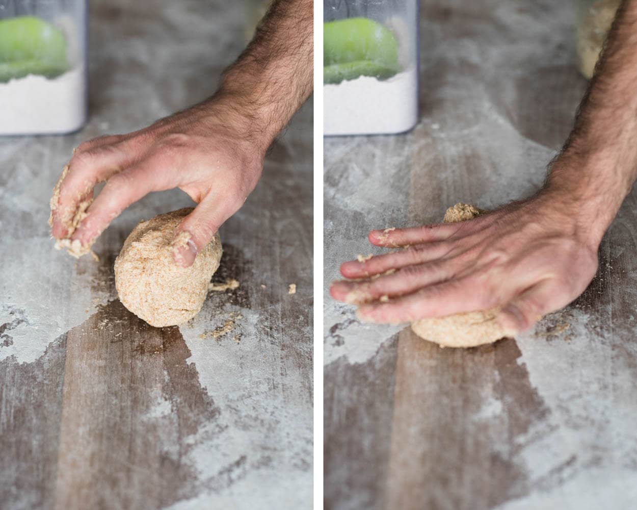 If the dough feels very wet and soupy, don’t add any remaining water. If it seems cohesive, add the remaining water 2, mixing it in until absorbed. Once again, scrape the dough out to the counter and use wet hands to slap and fold the dough for 3-5 minutes, making it smoother and more cohesive.