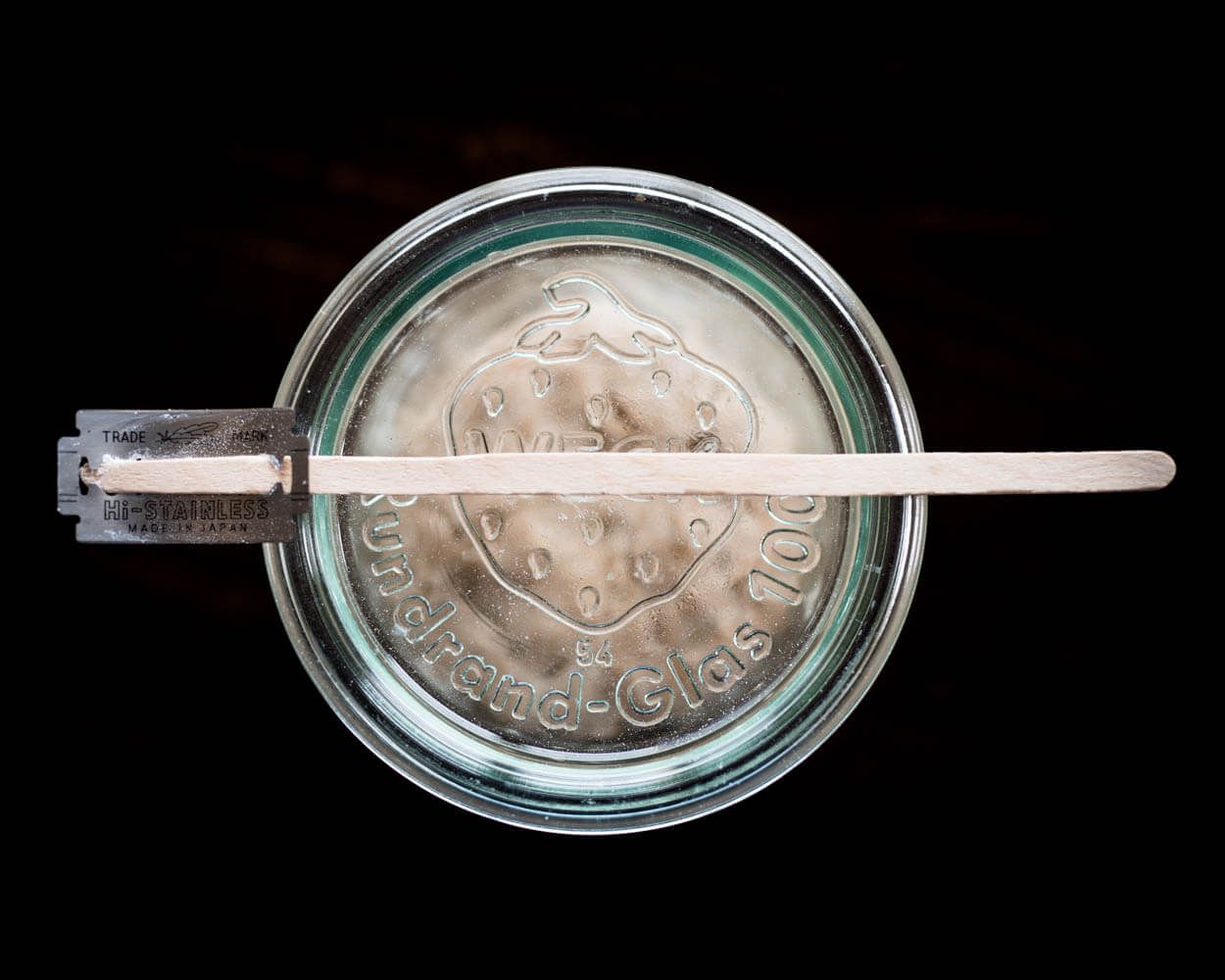 Mix the ingredients in the chart above in your favorite jar and leave them covered at a warm temperature, 74-76°F (23-24°C), to ripen for 5 hours. This is a stiff levain; if it is hard to knead the ingredients together, use more water as needed to make incorporation easier.