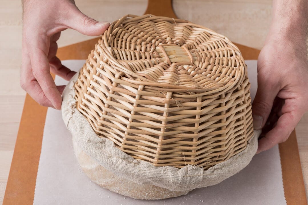 Cover the basket with a large, reusable plastic bag and seal shut. Place the basket in the refrigerator to proof overnight.