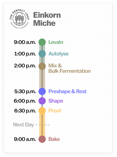 If you don’t have access to einkorn, I would experiment with freshly milled, or aged, whole red wheat in its place; the pronounced flavor of red wheat will add depth of flavor to the loaf. If you take this route, I would also add a small percentage of whole-grain rye flour (even just 5% will be noticeable) to round everything out.